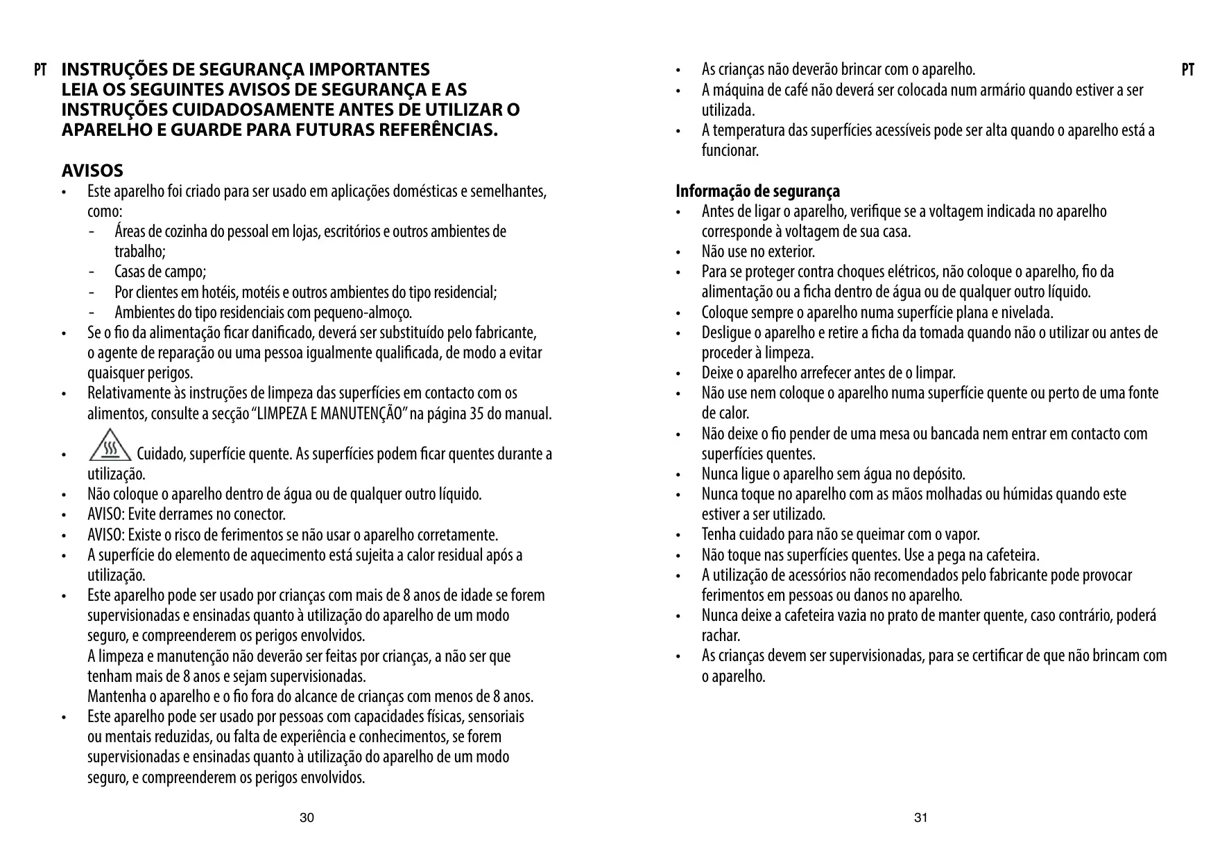 As crianças não deverão brincar com o aparelho. A máquina de café não deverá ser colocada num armário quando estiver a ser utilizada. A temperatura das superfícies acessíveis pode ser alta quando o aparelho está a funcionar. Informação de segurança