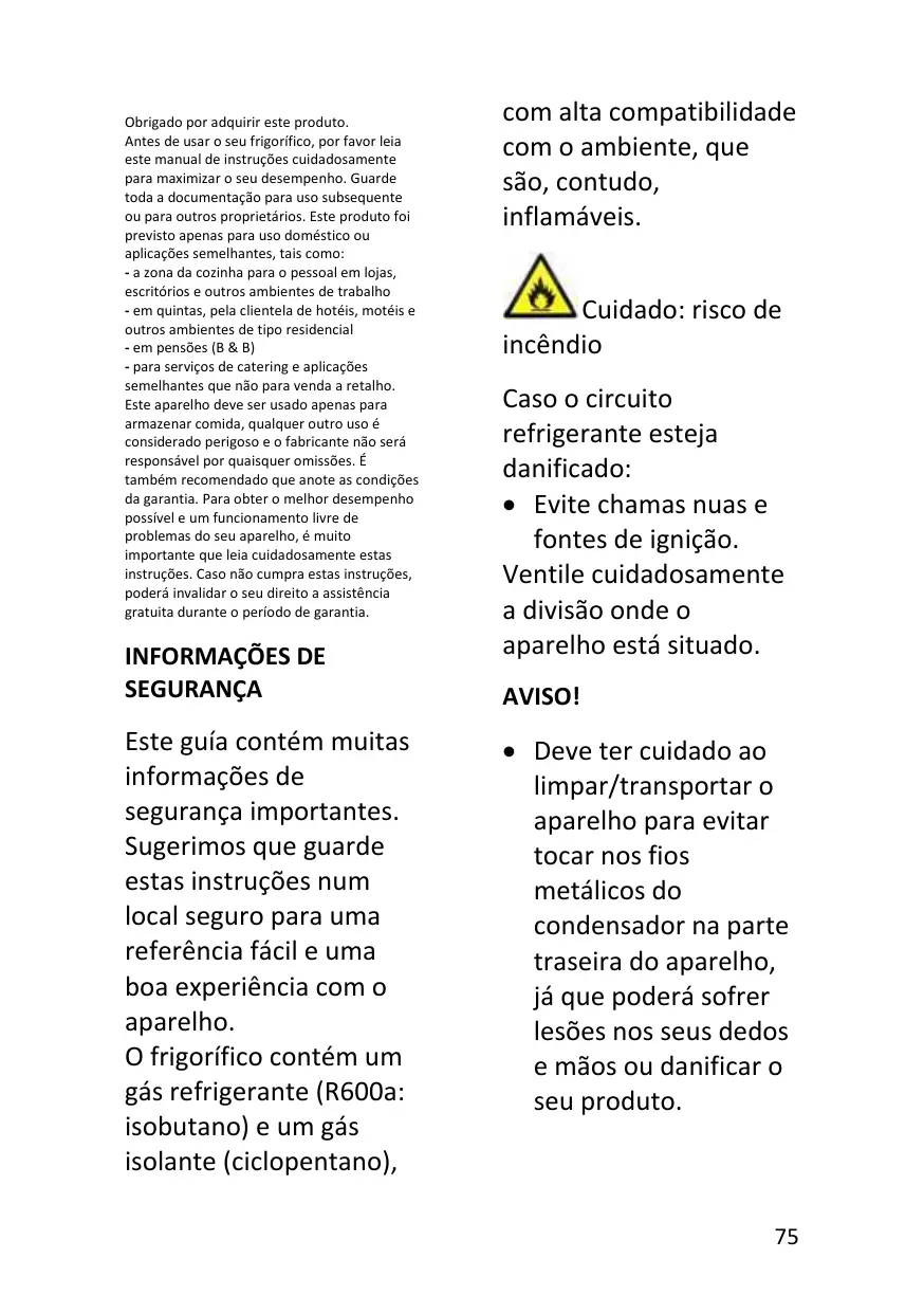 • Ne pas utiliser de dispositifs mécaniques ou d'autre équipement pour accélérer le processus de dégivrage. • Éviter impérativement l'utilisation de flamme nue ou d’un équipement électrique, comme des radiateurs, des nettoyeurs à vapeur, des bougies, des lampes à pétrole ou similaires pour accélérer la phase de dégivrage.