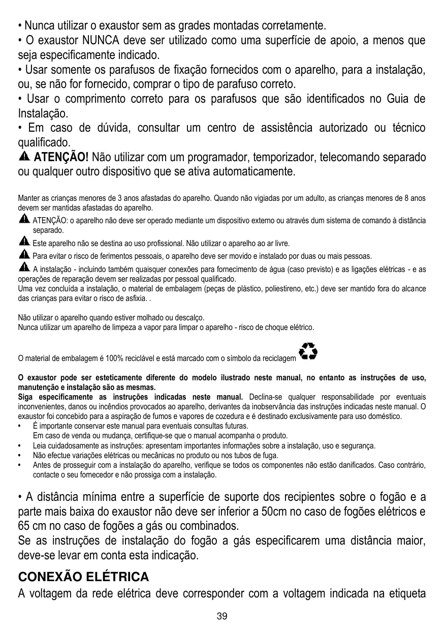ATTENTION : l’appareil ne peut être mis en marche par le biais d’un dispositif externe ou d’un système de commande à distance séparé. Cet appareil n’est pas destiné à un usage professionnel. Ne pas utiliser l’appareil à l’extérieur. Pour éviter le risque de lésions personnelles, l’appareil doit être déplacé et installé par deux ou plusieurs personnes. L'installation, comprenant éventuellement aussi les raccords pour l’alimentation hydriques (si prévus) et les branchements électriques , et les interventions de réparation doivent être effectués par un personnel qualifié. Après avoir complété l’installation, conserver le matériel d’emballage (plastique, polystyrène, etc.) hors de la portée des enfants pour éviter le risque d’étouffement. . Ne jamais utiliser l’appareil pieds nus ou mouillés. Ne jamais utiliser d’appareils de nettoyage à vapeur pour éviter le risque de choc électrique. Comme indiqué par le symbole, le matériel d’emballage est 100 % recyclable La hotte peut avoir des configurations esthétiques différentes par rapport à ce qui est illustré dans les dessins de ce manuel, cependant les instructions pour l’utilisation, l’entretien et l’installation restent identiques. Suivre impérativement les instructions de cette notice. Le constructeur décline toute responsabilité pour tous les inconvénients, dommages ou incendies provoqués à l’appareil et dûs à la non observation des instructions de la présente notice. Cet appareil est destiné à être utilisé dans des applications domestiques et analogues telles que : - des coins cuisines réservés au personnel dans des magasins, bureaux et autres environnements professionnels ; - des fermes ; - l’utilisation par les clients des hôtels, motels et autres environnements à caractère résidentiel ; - des environnements du type chambre d’hôtes. • Il est important de conserver ce livret pour pouvoir le consulter à tout moment. En cas de vente, de cession ou de déménagement, assurez-vous que la notice d'utilisation l'accompagne. • Veuillez lire attentivement les instructions, vous trouverez des informations importantes sur l'installation, le mode d'emploi et la sécurité. • Ne pas effectuer des modifications électriques ou mécaniques sur le produit ou sur les conduits d’évacuation. • Avant d'installer l'appareil, vérifiez qu’il n’y a aucun composant endommagé. Sinon, contactez votre revendeur et ne continuez pas l'installation.