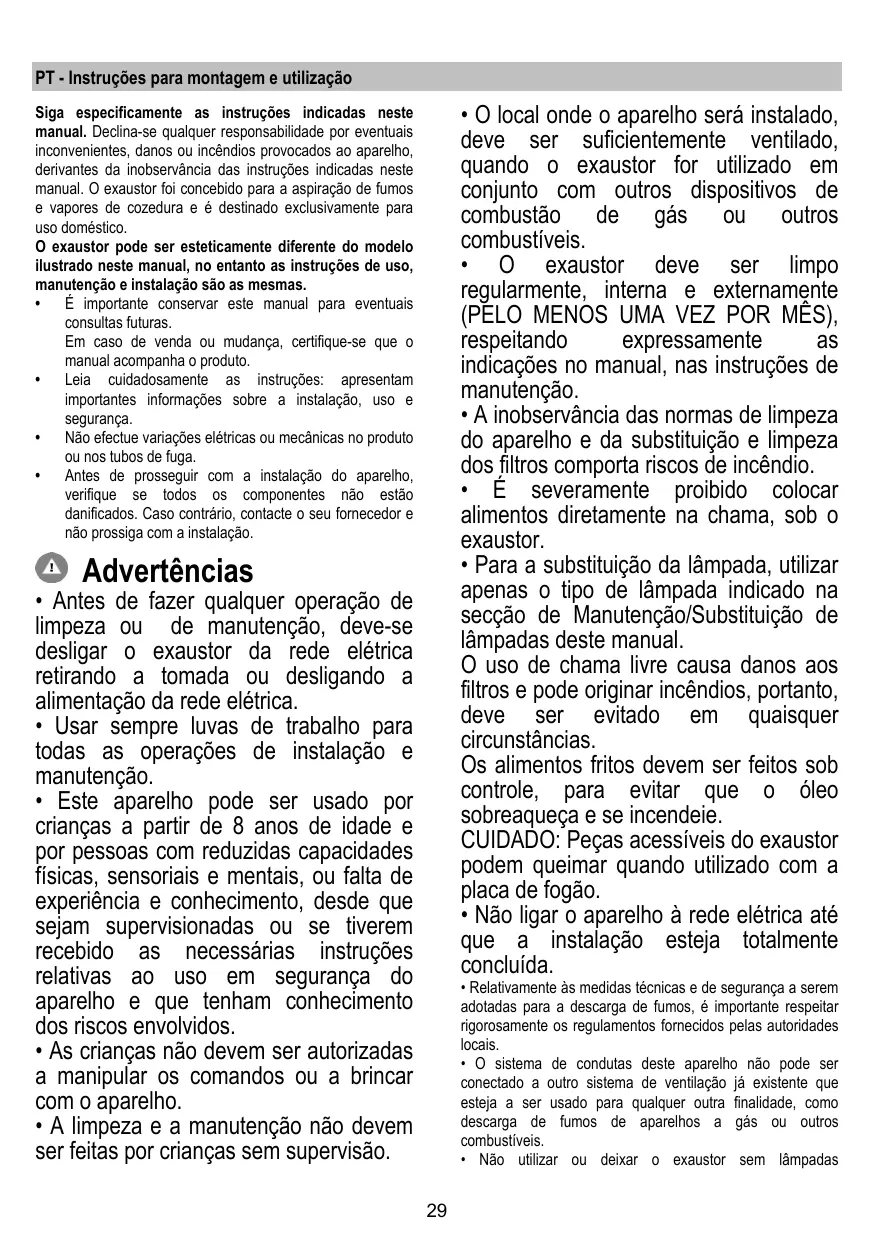Montaje y modo de empleo Instruções para montagem e utilização Ο∆ΗΓΙΕΣ ΣΥΝΑΡΜΟΛΟΓΗΣΗΣ ΚΑΙ ΧΡΗΣΗΣ Monterings- och bruksanvisningar • La pièce doit avoir une aération suffisante lorsque la hotte est utilisée conjointement avec d'autres appareils fonctionnant au gaz ou autres combustibles. • La hotte doit être régulièrement nettoyée à la fois à l'intérieur et à l'extérieur (AU MOINS UNE FOIS PAR MOIS); cela devrait se faire en conformité avec les instructions d'entretien. Le non respect des instructions expressément fournies concernant le nettoyage de la hotte et des filtres peut provoquer des risques d'incendie. • Ne pas flamber d’aliments sous la hotte. • Pour le remplacement de la lampe, utilisez uniquement le type de lampe spécifié dans la section remplacement/maintenance lampe dans ce manuel. L'utilisation d'une flamme nue est dommageable pour les filtres et peut causer un incendie, par conséquent, il est déconseillé de l'utiliser. La friture doit être faite avec soin afin de s’assurer que l’huile surchauffée ne prenne pas feu. AVERTISSEMENT: Lorsque la table de cuisson est en fonctionnement, les parties accessibles de la hotte peuvent devenir très chaudes. • Ne pas brancher l'appareil au réseau électrique avant que l'installation est complètement terminée.