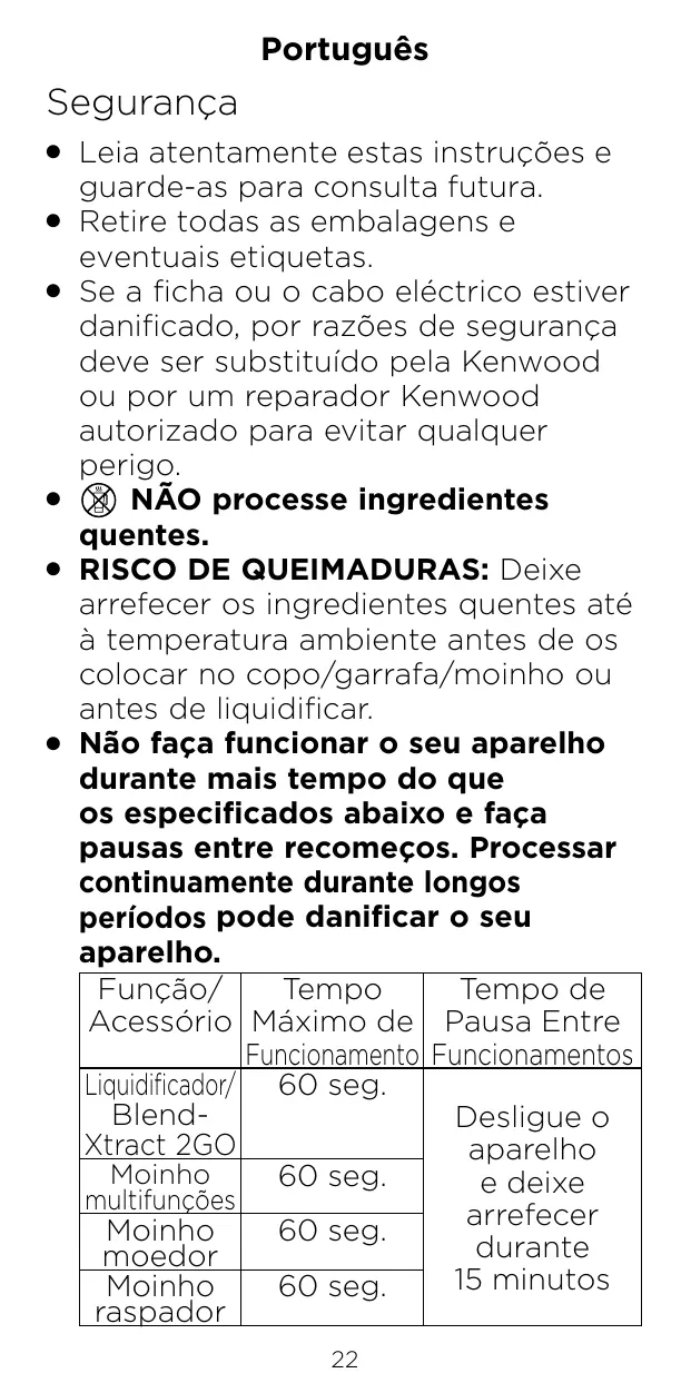 Blender/ Moulin à 60 sec refroidir râper pendant 15 minutes Éteignez et débranchez l’appareil avant le montage ou le démontage de pièces, lorsqu’il n’est pas utilisé ou avant le nettoyage. N’installez jamais l’unité portelames sur le bloc moteur sans que le gobelet/la bouteille du blender ou 10