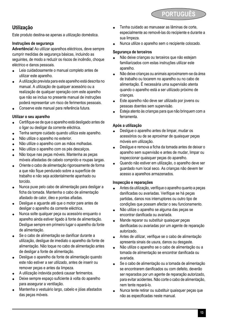 X Após a utilização X Desligue o aparelho antes de limpar, mudar os acessórios ou de se aproximar de quaisquer peças móveis em utilização. X Desligue e remova a ficha da tomada antes de deixar o aparelho sem supervisão e antes de mudar, limpar ou inspeccionar quaisquer peças do aparelho. X Quando não estiver em utilização, o aparelho deve ser guardado num local seco. As crianças não devem ter acesso a aparelhos armazenados. Inspecção e reparações X Antes da utilização, verifique o aparelho quanto a peças danificadas ou avariadas. Verifique se há peças partidas, danos nos interruptores ou outro tipo de condições que possam afectar o seu funcionamento. X Não utilize o aparelho se alguma das peças se encontrar danificada ou avariada. X Mande reparar ou substituir quaisquer peças danificadas ou avariadas por um agente de reparação autorizado. X Antes de utilizar, verifique se o cabo de alimentação apresenta sinais de usura, danos ou desgaste. X Não utilize o aparelho se o cabo de alimentação ou a tomada de alimentação se encontrar danificada ou avariada. X Se o cabo de alimentação ou a tomada de alimentação se encontrarem danificados ou com defeito, deverão ser reparados por um agente de reparação autorizado, para evitar acidentes. Não corte o cabo de alimentação, nem tente repará-lo. X Nunca tente retirar ou substituir quaisquer peças que não as especificadas neste manual.