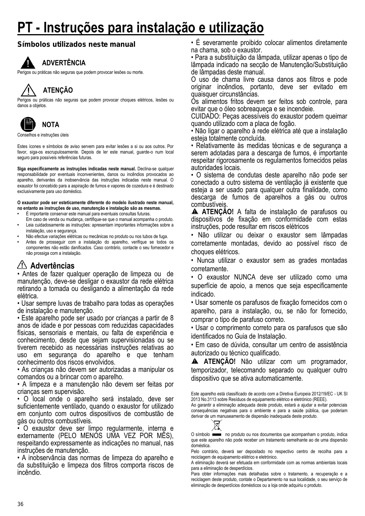 • É severamente proibido colocar alimentos diretamente na chama, sob o exaustor. • Para a substituição da lâmpada, utilizar apenas o tipo de lâmpada indicado na secção de Manutenção/Substituição de lâmpadas deste manual. O uso de chama livre causa danos aos filtros e pode originar incêndios, portanto, deve ser evitado em quaisquer circunstâncias. Os alimentos fritos devem ser feitos sob controle, para evitar que o óleo sobreaqueça e se incendeie. CUIDADO: Peças acessíveis do exaustor podem queimar quando utilizado com a placa de fogão. • Não ligar o aparelho à rede elétrica até que a instalação esteja totalmente concluída. • Relativamente às medidas técnicas e de segurança a serem adotadas para a descarga de fumos, é importante respeitar rigorosamente os regulamentos fornecidos pelas autoridades locais. • O sistema de condutas deste aparelho não pode ser conectado a outro sistema de ventilação já existente que esteja a ser usado para qualquer outra finalidade, como descarga de fumos de aparelhos a gás ou outros combustíveis. ATENÇÃO! A falta de instalação de parafusos ou dispositivos de fixação em conformidade com estas instruções, pode resultar em riscos elétricos • Não utilizar ou deixar o exaustor sem lâmpadas corretamente montadas, devido ao possível risco de choques elétricos. • Nunca utilizar o exaustor sem as grades montadas corretamente. • O exaustor NUNCA deve ser utilizado como uma superfície de apoio, a menos que seja especificamente indicado. • Usar somente os parafusos de fixação fornecidos com o aparelho, para a instalação, ou, se não for fornecido, comprar o tipo de parafuso correto. • Usar o comprimento correto para os parafusos que são identificados no Guia de Instalação. • Em caso de dúvida, consultar um centro de assistência autorizado ou técnico qualificado. ATENÇÃO! Não utilizar com um programador, temporizador, telecomando separado ou qualquer outro dispositivo que se ativa automaticamente. Este aparelho está classificado de acordo com a Diretiva Europeia 2012/19/EC - UK SI 2013 No.3113 sobre Resíduos de equipamento elétrico e eletrónico (REEE). Ao garantir a eliminação adequada deste produto, estará a ajudar a evitar potenciais consequências negativas para o ambiente e para a saúde pública, que poderiam derivar de um manuseamento de dispersão inadequada deste produto.