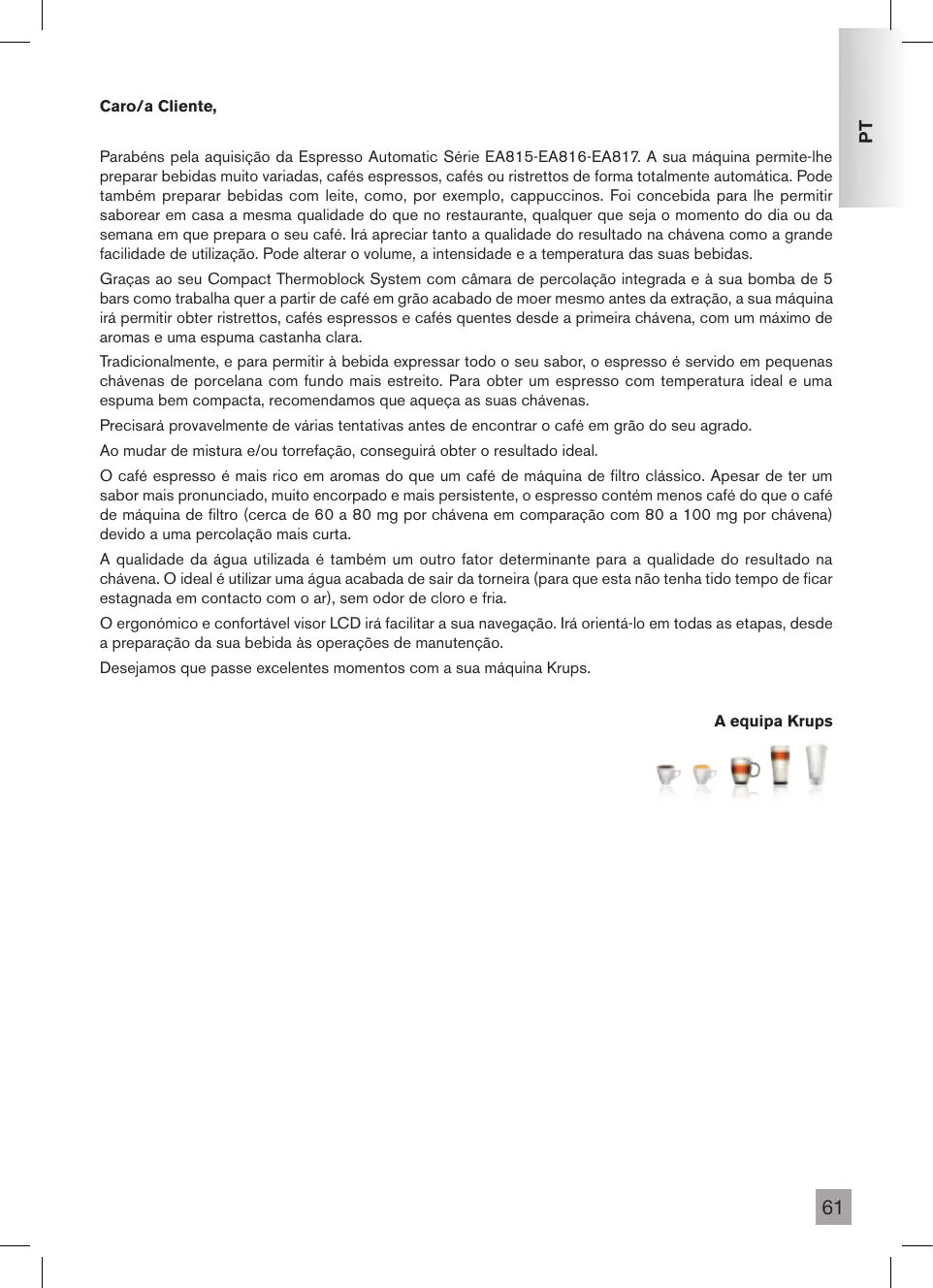 PT Caro/a Cliente, Parabéns pela aquisição da Espresso Automatic Série EA815-EA816-EA817. A sua máquina permite-lhe preparar bebidas muito variadas, cafés espressos, cafés ou ristrettos de forma totalmente automática. Pode também preparar bebidas com leite, como, por exemplo, cappuccinos. Foi concebida para lhe permitir saborear em casa a mesma qualidade do que no restaurante, qualquer que seja o momento do dia ou da semana em que prepara o seu café. Irá apreciar tanto a qualidade do resultado na chávena como a grande facilidade de utilização. Pode alterar o volume, a intensidade e a temperatura das suas bebidas. Graças ao seu Compact Thermoblock System com câmara de percolação integrada e à sua bomba de 5 bars como trabalha quer a partir de café em grão acabado de moer mesmo antes da extração, a sua máquina irá permitir obter ristrettos, cafés espressos e cafés quentes desde a primeira chávena, com um máximo de aromas e uma espuma castanha clara. Tradicionalmente, e para permitir à bebida expressar todo o seu sabor, o espresso é servido em pequenas chávenas de porcelana com fundo mais estreito. Para obter um espresso com temperatura ideal e uma espuma bem compacta, recomendamos que aqueça as suas chávenas. Precisará provavelmente de várias tentativas antes de encontrar o café em grão do seu agrado. Ao mudar de mistura e/ou torrefação, conseguirá obter o resultado ideal. O café espresso é mais rico em aromas do que um café de máquina de filtro clássico. Apesar de ter um sabor mais pronunciado, muito encorpado e mais persistente, o espresso contém menos café do que o café de máquina de filtro (cerca de 60 a 80 mg por chávena em comparação com 80 a 100 mg por chávena) devido a uma percolação mais curta. A qualidade da água utilizada é também um outro fator determinante para a qualidade do resultado na chávena. O ideal é utilizar uma água acabada de sair da torneira (para que esta não tenha tido tempo de ficar estagnada em contacto com o ar), sem odor de cloro e fria. O ergonómico e confortável visor LCD irá facilitar a sua navegação. Irá orientá-lo em todas as etapas, desde a preparação da sua bebida às operações de manutenção. Desejamos que passe excelentes momentos com a sua máquina Krups. A equipa Krups