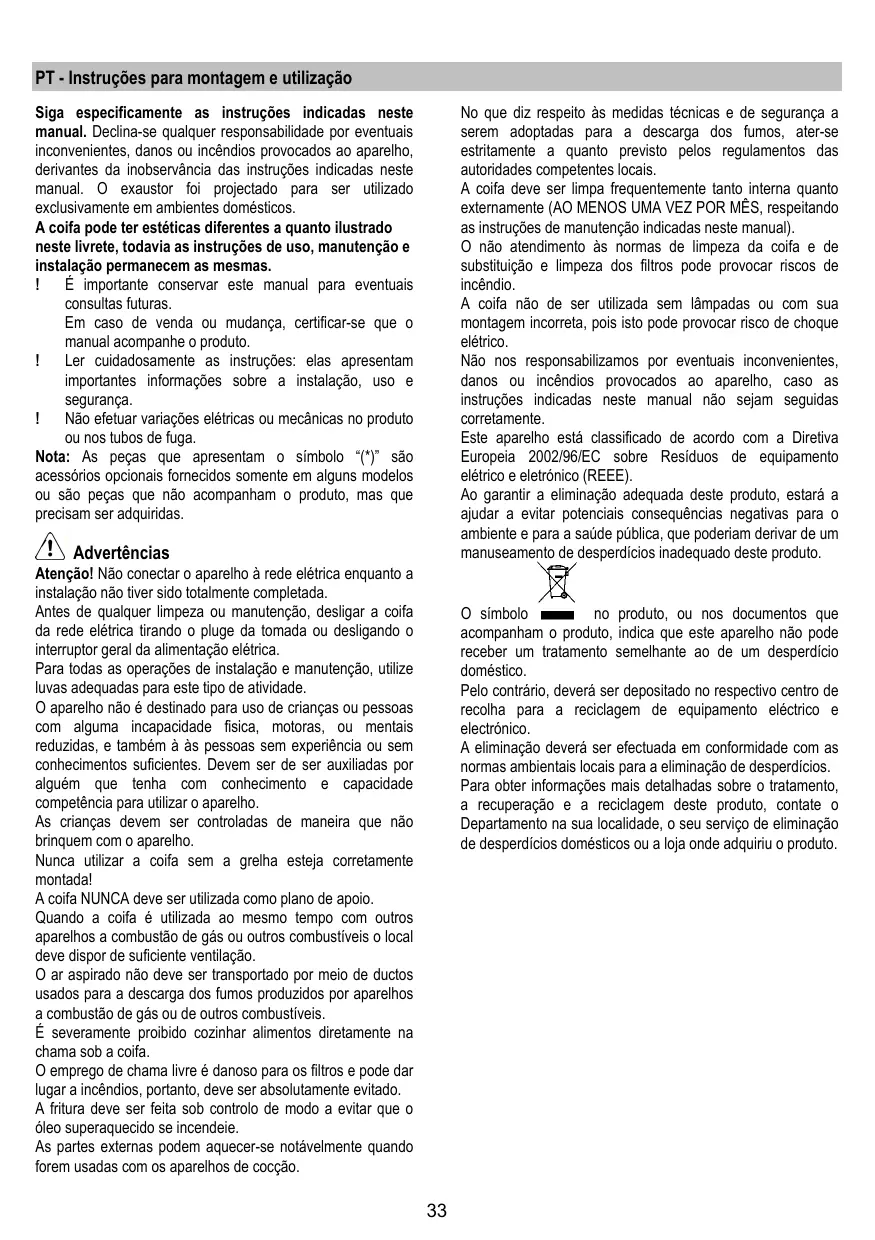 Les pièces accessibles peuvent se réchauffer de façon importante quand elles sont utilisées avec des appareils pour la cuisson. En ce qui concerne les mesures techniques et de sécurité à adopter pour l’évacuation des fumées, s’en tenir strictement à ce qui est prévu dans les règlements des autorités locales compétentes. La hotte doit être régulièrement nettoyée, aussi bien à l’intérieur qu’à l’extérieur (AU MOINS UNE FOIS PAR MOIS, respecter néanmoins les instructions relatives à l’entretien fournies dans ce manuel). La non observation de ces normes de nettoyage de la hotte et du changement et nettoyage des filtres comporte des risques d’incendie. Ne pas utiliser ou laisser la hotte sans que les ampoules soient correctement placées pour éviter tout risque de choc électrique. La société décline toute responsabilité pour d’éventuels inconvénients, dégâts ou incendies provoqués par l’appareil et dérivés de la non observation des instructions reprises dans ce manuel. Cet appareil porte le symbole du recyclage conformément à la Directive Européenne 2002/96/CE concernant les Déchets d’Équipements Électriques et Électroniques (DEEE ou WEEE). En procédant correctement à la mise au rebut de cet appareil, vous contribuerez à empêcher toute conséquence nuisible pour l’environnement et la santé de l’homme.