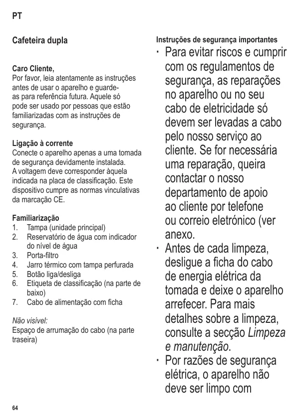 PT Cafeteira dupla Caro Cliente, Por favor, leia atentamente as instruções antes de usar o aparelho e guardeas para referência futura. Aquele só pode ser usado por pessoas que estão familiarizadas com as instruções de segurança. Ligação à corrente Conecte o aparelho apenas a uma tomada de segurança devidamente instalada. A voltagem deve corresponder àquela indicada na placa de classificação. Este dispositivo cumpre as normas vinculativas da marcação CE. Familiarização 1. Tampa (unidade principal) 2. Reservatório de água com indicador do nível de água 3. Porta-filtro 4. Jarro térmico com tampa perfurada 5. Botão liga/desliga 6. Etiqueta de classificação (na parte de baixo) 7. Cabo de alimentação com ficha Não visível: Espaço de arrumação do cabo (na parte traseira)