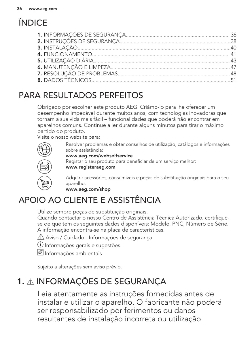 Obrigado por escolher este produto AEG. Criámo-lo para lhe oferecer um desempenho impecável durante muitos anos, com tecnologias inovadoras que tornam a sua vida mais fácil – funcionalidades que poderá não encontrar em aparelhos comuns. Continue a ler durante alguns minutos para tirar o máximo partido do produto. Visite o nosso website para: Resolver problemas e obter conselhos de utilização, catálogos e informações sobre assistência: www.aeg.com/webselfservice Registar o seu produto para beneficiar de um serviço melhor: www.registeraeg.com Adquirir acessórios, consumíveis e peças de substituição originais para o seu aparelho: www.aeg.com/shop