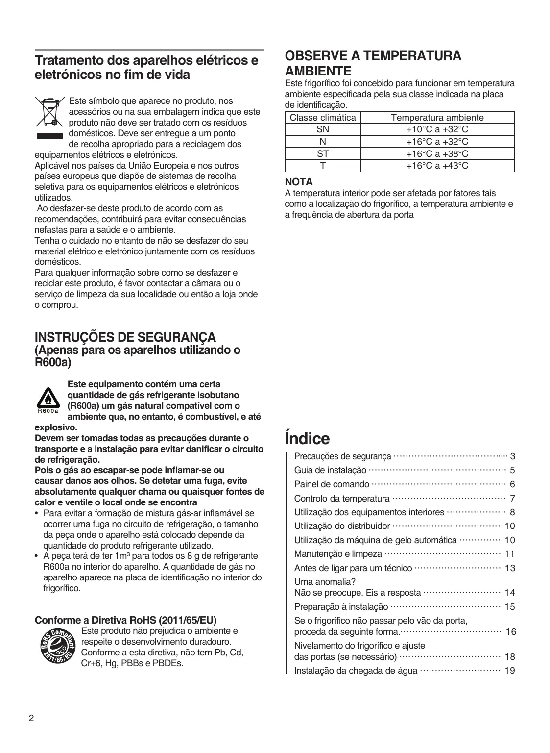 Índice Precauções de segurança ······································· 3 Guia de instalação ·············································· 5 Painel de comando ············································· 6 Controlo da temperatura ······································ 7 Utilização dos equipamentos interiores ···················· 8 Utilização do distribuidor ···································· 10 Utilização da máquina de gelo automática ·············· 10 Manutenção e limpeza ······································· 11 Antes de ligar para um técnico ····························· 13 Uma anomalia? Não se preocupe. Eis a resposta ·························· 14 Preparação à instalação ····································· 15