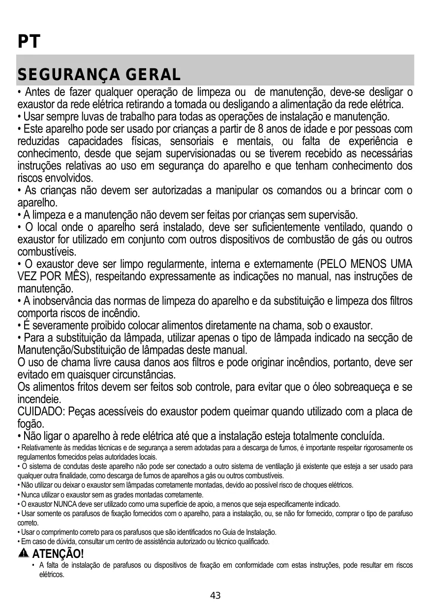 - O exaustor deve ser limpo regularmente, interna e externamente (PELO MENOS UMA VEZ POR MÊS), respeitando expressamente as indicações no manual, nas instruções de manutenção.