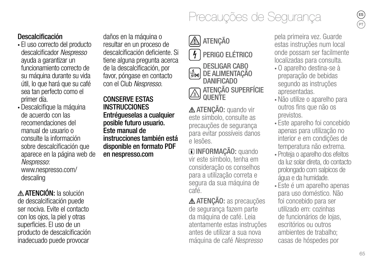 Cappuccino e lave todas peças no cesto superior da máquina de lavar louça. No caso de não ter um máquina de lavar louça disponível, consulte a secção «Lavagem à Mão do sistema de Preparação Automática de Cappuccino». Consulte el apartado «Montaje / Desmontaje del Rapid Cappuccino System». El Rapid Cappuccino System no ha sido diseñado para guardarse en el frigorífico. Consulte a secção «Montagem / Desmontagem do sistema de Preparação Automática de Cappuccino». O sistema de Preparação Automática de Cappuccino não foi concebido para ser guardado no frigorifico. Nespresso y 500 ml de agua. Esvazie a gaveta de recolha de pingos e o recipiente de cápsulas usadas. Encha o depósito de água com 100 ml de agente de descalcificação Nespresso e 500 ml de água.