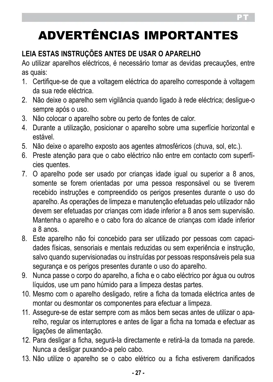 PT ADVERTÊNCIAS IMPORTANTES LEIA ESTAS INSTRUÇÕES ANTES DE USAR O APARELHO Ao utilizar aparelhos eléctricos, é necessário tomar as devidas precauções, entre as quais: 1. Certifique-se de que a voltagem eléctrica do aparelho corresponde à voltagem da sua rede eléctrica. 2. Não deixe o aparelho sem vigilância quando ligado à rede eléctrica; desligue-o sempre após o uso. 3. Não colocar o aparelho sobre ou perto de fontes de calor. 4. Durante a utilização, posicionar o aparelho sobre uma superfície horizontal e estável. 5. Não deixe o aparelho exposto aos agentes atmosféricos (chuva, sol, etc.). 6. Preste atenção para que o cabo eléctrico não entre em contacto com superfícies quentes. 7. O aparelho pode ser usado por crianças idade igual ou superior a 8 anos, somente se forem orientadas por uma pessoa responsável ou se tiverem recebido instruções e compreendido os perigos presentes durante o uso do aparelho. As operações de limpeza e manutenção efetuadas pelo utilizador não devem ser efetuadas por crianças com idade inferior a 8 anos sem supervisão. Mantenha o aparelho e o cabo fora do alcance de crianças com idade inferior a 8 anos. 8. Este aparelho não foi concebido para ser utilizado por pessoas com capacidades físicas, sensoriais e mentais reduzidas ou sem experiência e instrução, salvo quando supervisionadas ou instruídas por pessoas responsáveis pela sua segurança e os perigos presentes durante o uso do aparelho. 9. Nunca passe o corpo do aparelho, a ficha e o cabo eléctrico por água ou outros líquidos, use um pano húmido para a limpeza destas partes. 10. Mesmo com o aparelho desligado, retire a ficha da tomada eléctrica antes de montar ou desmontar os componentes para efectuar a limpeza. 11. Assegure-se de estar sempre com as mãos bem secas antes de utilizar o aparelho, regular os interruptores e antes de ligar a ficha na tomada e efectuar as ligações de alimentação. 12. Para desligar a ficha, segurá-la directamente e retirá-la da tomada na parede. Nunca a desligar puxando-a pelo cabo. 13. Não utilize o aparelho se o cabo elétrico ou a ficha estiverem danificados - 27 -