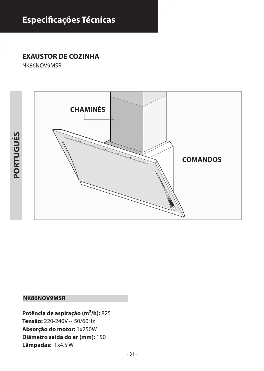 EXAUSTOR DE COZINHA NK86NOV9MSR PORTUGUÊS CHAMINÉS COMANDOS NK86NOV9MSR Potência de aspiração (m³/h): 825 Tensão: 220-240V ~ 50/60Hz Absorção do motor: 1x250W Diâmetro saída do ar (mm): 150 Lâmpadas: 1x4.5 W - 31 -