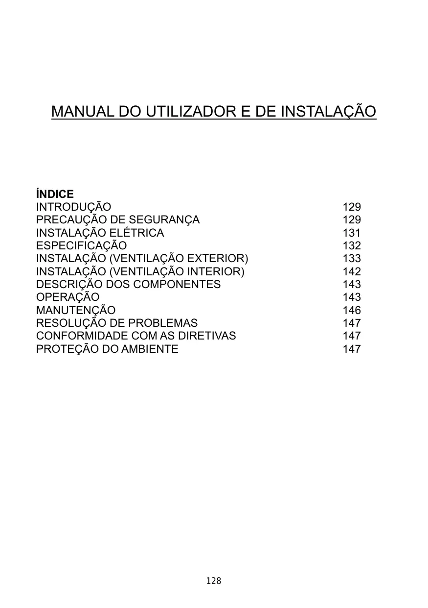 ÍNDICE INTRODUÇÃO PRECAUÇÃO DE SEGURANÇA INSTALAÇÃO ELÉTRICA ESPECIFICAÇÃO INSTALAÇÃO (VENTILAÇÃO EXTERIOR) INSTALAÇÃO (VENTILAÇÃO INTERIOR) DESCRIÇÃO DOS COMPONENTES OPERAÇÃO MANUTENÇÃO RESOLUÇÃO DE PROBLEMAS CONFORMIDADE COM AS DIRETIVAS PROTEÇÃO DO AMBIENTE