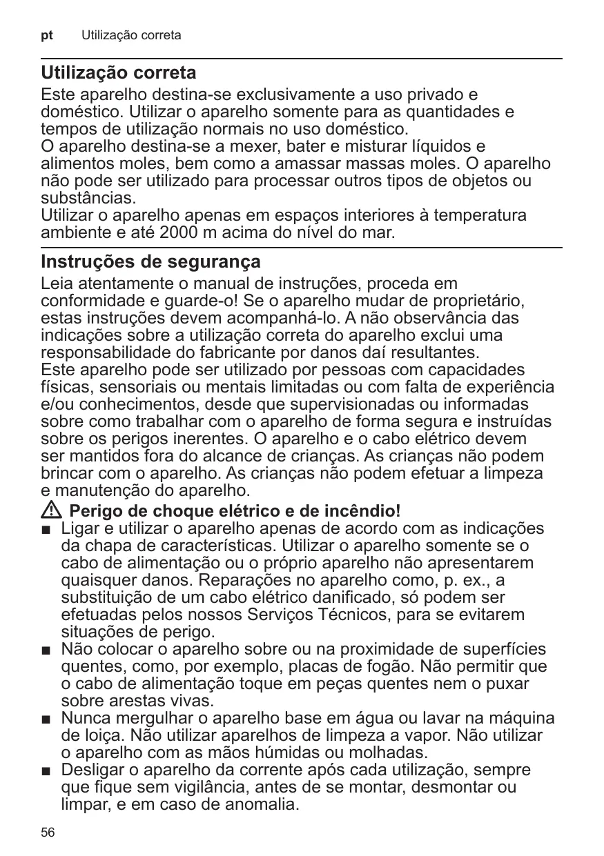 Leia atentamente o manual de instruções, proceda em conformidade e guarde-o! Se o aparelho mudar de proprietário, estas instruções devem acompanhá-lo. A não observância das indicações sobre a utilização correta do aparelho exclui uma responsabilidade do fabricante por danos daí resultantes. Este aparelho pode ser utilizado por pessoas com capacidades físicas, sensoriais ou mentais limitadas ou com falta de experiência e/ou conhecimentos, desde que supervisionadas ou informadas sobre como trabalhar com o aparelho de forma segura e instruídas sobre os perigos inerentes. O aparelho e o cabo elétrico devem ser mantidos fora do alcance de crianças. As crianças não podem brincar com o aparelho. As crianças não podem efetuar a limpeza e manutenção do aparelho. WW Perigo de choque elétrico e de incêndio! ■■ Ligar e utilizar o aparelho apenas de acordo com as indicações da chapa de características. Utilizar o aparelho somente se o cabo de alimentação ou o próprio aparelho não apresentarem quaisquer danos. Reparações no aparelho como, p. ex., a substituição de um cabo elétrico danificado, só podem ser efetuadas pelos nossos Serviços Técnicos, para se evitarem situações de perigo. ■■ Não colocar o aparelho sobre ou na proximidade de superfícies quentes, como, por exemplo, placas de fogão. Não permitir que o cabo de alimentação toque em peças quentes nem o puxar sobre arestas vivas. ■■ Nunca mergulhar o aparelho base em água ou lavar na máquina de loiça. Não utilizar aparelhos de limpeza a vapor. Não utilizar o aparelho com as mãos húmidas ou molhadas. ■■ Desligar o aparelho da corrente após cada utilização, sempre que fique sem vigilância, antes de se montar, desmontar ou limpar, e em caso de anomalia. 56