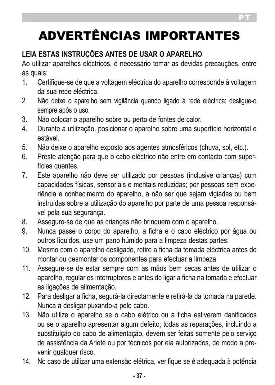 PT ADVERTÊNCIAS IMPORTANTES LEIA ESTAS INSTRUÇÕES ANTES DE USAR O APARELHO Ao utilizar aparelhos eléctricos, é necessário tomar as devidas precauções, entre as quais: 1. Certifique-se de que a voltagem eléctrica do aparelho corresponde à voltagem da sua rede eléctrica. 2. Não deixe o aparelho sem vigilância quando ligado à rede eléctrica; desligue-o sempre após o uso. 3. Não colocar o aparelho sobre ou perto de fontes de calor. 4. Durante a utilização, posicionar o aparelho sobre uma superfície horizontal e estável. 5. Não deixe o aparelho exposto aos agentes atmosféricos (chuva, sol, etc.). 6. Preste atenção para que o cabo eléctrico não entre em contacto com superfícies quentes. 7. Este aparelho não deve ser utilizado por pessoas (inclusive crianças) com capacidades físicas, sensoriais e mentais reduzidas; por pessoas sem experiência e conhecimento do aparelho, a não ser que sejam vigiadas ou bem instruídas sobre a utilização do aparelho por parte de uma pessoa responsável pela sua segurança. 8. Assegure-se de que as crianças não brinquem com o aparelho. 9. Nunca passe o corpo do aparelho, a ficha e o cabo eléctrico por água ou outros líquidos, use um pano húmido para a limpeza destas partes. 10. Mesmo com o aparelho desligado, retire a ficha da tomada eléctrica antes de montar ou desmontar os componentes para efectuar a limpeza. 11. Assegure-se de estar sempre com as mãos bem secas antes de utilizar o aparelho, regular os interruptores e antes de ligar a ficha na tomada e efectuar as ligações de alimentação. 12. Para desligar a ficha, segurá-la directamente e retirá-la da tomada na parede. Nunca a desligar puxando-a pelo cabo. 13. Não utilize o aparelho se o cabo elétrico ou a ficha estiverem danificados ou se o aparelho apresentar algum defeito; todas as reparações, incluindo a substituição do cabo de alimentação, devem ser feitas somente pelo serviço de assistência da Ariete ou por técnicos por ela autorizados, de modo a prevenir qualquer risco. 14. No caso de utilizar uma extensão elétrica, verifique se é adequada à potência - 37 -
