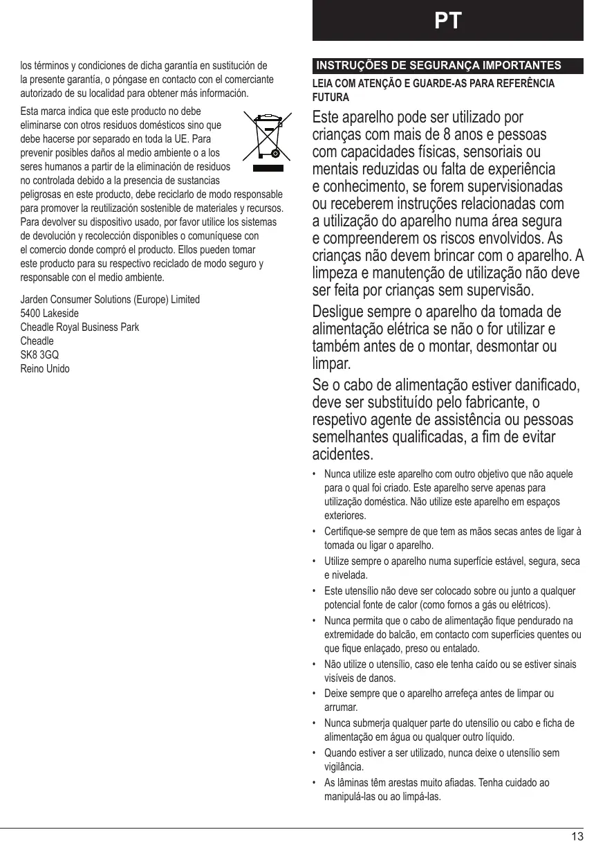 PT los términos y condiciones de dicha garantía en sustitución de la presente garantía, o póngase en contacto con el comerciante autorizado de su localidad para obtener más información. Esta marca indica que este producto no debe eliminarse con otros residuos domésticos sino que debe hacerse por separado en toda la UE. Para prevenir posibles daños al medio ambiente o a los seres humanos a partir de la eliminación de residuos no controlada debido a la presencia de sustancias peligrosas en este producto, debe reciclarlo de modo responsable para promover la reutilización sostenible de materiales y recursos. Para devolver su dispositivo usado, por favor utilice los sistemas de devolución y recolección disponibles o comuníquese con el comercio donde compró el producto. Ellos pueden tomar este producto para su respectivo reciclado de modo seguro y responsable con el medio ambiente. Jarden Consumer Solutions (Europe) Limited 5400 Lakeside Cheadle Royal Business Park Cheadle SK8 3GQ Reino Unido