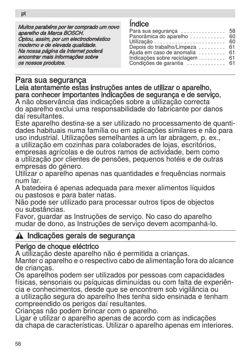 , Indicações de segurança para este aparelho Perigo de ferimentos Perigo de choque eléctrico No caso duma falha de corrente, o aparelho continua ligado e volta a funcionar, logo que volte a corrente. Desligar imediatamente o aparelho. Nunca mergulhar o aparelho base em líquidos nem lavá-lo na máquina de lavar loiça. Não utilizar aparelhos de limpeza a vapor! Não mergulhar o aparelho em líquidos através do ponto de ligação entre a varinha de mistura rápida e o aparelho base. Não utilizar o aparelho com as mãos húmidas ou molhadas. Não utilizar o aparelho em vazio. O aparelho só deve funcionar com acessórios originais. Só utilizar ferramentas de um tipo (p. ex. varas para massas pesadas). Recomenda-se que o aparelho nunca deve ficar ligado mais tempo que o necessário para a preparação do batido. O copo misturador não é adequado para utilização no microondas. Perigo de ferimentos devido a peças em rotação. Nunca tocar na ferramenta em rotação. Só colocar ou retirar as ferramentas depois de o aparelho estar parado – depois de desligado, o aparelho ainda funciona por breves instantes. Proteger cabelos compridos ou peças de roupa soltas para não ficarem presos nas ferramentas em rotação. Robert Bosch Hausgeräte GmbH