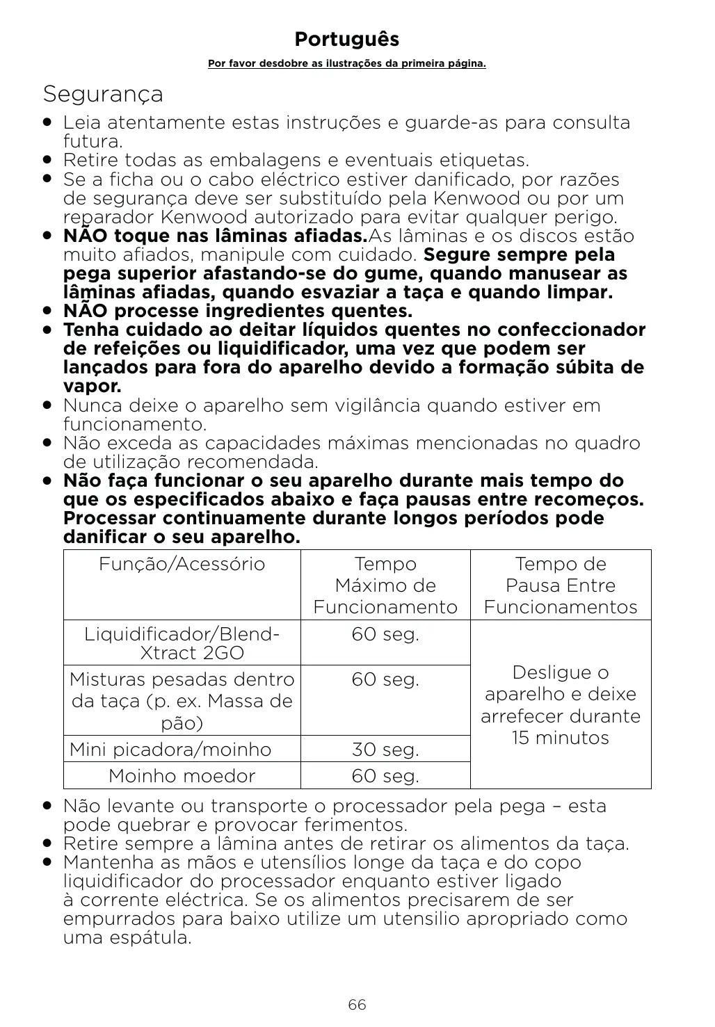 Weegfunctie O Si le cordon ou la prise sont endommagés, il faut les faire remplacer, pour des raisons de sécurité, par Kenwood ou un réparateur agréé par Kenwood pour éviter tout accident. O NE TOUCHEZ PAS les lames, elles sont tranchantes. Les lames et les disques sont très tranchants, manipulez-les avec précaution. Tenez toujours les ustensiles et accessoires par la partie supérieure, loin des zones coupantes, lorsque vous les manipulez, que vous videz le bol ou pendant le nettoyage. O Veuillez NE PAS MIXER des ingrédients chauds. O Soyez prudent lorsque vous versez des liquides chauds dans le bol du robot ou du blender, la production soudaine de vapeur entraine un risque de projections. O Ne laissez jamais l’appareil sans surveillance lorsqu’il fonctionne. O Ne dépassez pas les capacités maximales données dans le tableau des conseils d’utilisation. O N’utilisez pas votre appareil pendant plus de temps que celui spécifié ci-dessous sans période d’arrêt. Si vous l'utilisez pendant de plus longues périodes, vous risquez d'endommager l'appareil. Fonction/accessoire Temps Temps d’arrêt entre d’utilisation les utilisations maximal Blender/Blend-Xtract 2GO O Veillez toujours à retirer la lame avant de verser le contenu du bol. O Conservez les mains et tout ustensile hors du bol du robot ou du blender lorsque l’appareil est branché sur l’alimentation électrique. Si vous devez pousser des aliments, utilisez un ustensile approprié tel qu'une spatule. O Éteignez toujours l'appareil et débranchez-le de l'alimentation lorsque vous devez le laisser sans surveillance et avant d'installer de retirer, ou de nettoyer les accessoires. O