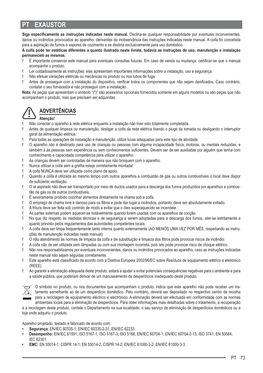 15 minuten. Opmerking: om de kalibratie te onderbreken druk 5 seconden lang op T3; de kalibratie is dan niet geldig en moet dus herhaald worden. MANUTENÇÃO Atenção! Antes de qualquer operação de limpeza ou manutenção, desconectar a coifa da rede elétrica tirando o pluge da tomada ou desligando o interruptor geral da alimentação elétrica.