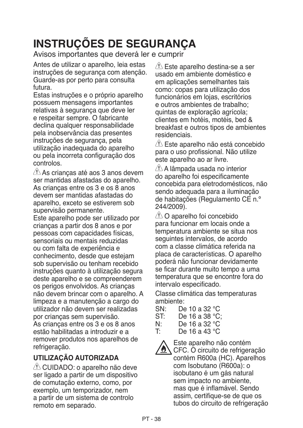 Este aparelho destina-se a ser usado em ambiente doméstico e em aplicações semelhantes tais como: copas para utilização dos funcionários em lojas, escritórios e outros ambientes de trabalho; quintas de exploração agrícola; clientes em hotéis, motéis, bed & breakfast e outros tipos de ambientes residenciais. Este aparelho não está concebido para o uso profissional. Não utilize este aparelho ao ar livre. A lâmpada usada no interior do aparelho foi especificamente concebida para eletrodomésticos, não sendo adequada para a iluminação de habitações (Regulamento CE n.º 244/2009). O aparelho foi concebido para funcionar em locais onde a temperatura ambiente se situa nos seguintes intervalos, de acordo com a classe climática referida na placa de características. O aparelho poderá não funcionar devidamente se ficar durante muito tempo a uma temperatura que se encontre fora do intervalo especificado. Classe climática das temperaturas ambiente: SN: De 10 a 32 °C ST: De 16 a 38 °C; N: De 16 a 32 °C T:
