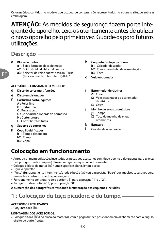 (selon modèle) • Placez l’ensemble sur le bloc moteur (a). MISE EN MARCHE ET CONSEILS : • Tournez le sélecteur de vitesse (a3) sur la position «2» pour la mise en marche, tout en maintenant le moulin fines-herbes sur le bloc moteur durant le fonctionnement. Vous pouvez utiliser la position «Pulse», pour un meilleur contrôle du mélange. • Avec le moulin fines-herbes (j) vous pouvez hacher en quelques secondes : - ail, persil, oignon, biscottes (pour chapelure), jambon… Quantité / Temps maximum : 50 g / 10 s - abricots secs, figues sèches, pruneaux dénoyautés Rincez le bol. • Ne mettez pas le bloc moteur (a) dans l’eau, ni sous l’eau courante. Essuyez-le avec une éponge humide. • Les lames des accessoires sont très affûtées. Manipulez-les avec précaution. Astuce : En cas de coloration de vos accessoires par des aliments (carottes, oranges...), frottez-les avec un chiffon imbibé d’huile alimentaire, puis procédez au nettoyage habituel.