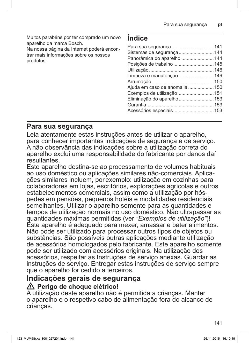 Este aparelho destina-se ao processamento de volumes habituais ao uso doméstico ou aplicaçôes similares näo-comerciais. Aplica- çôes similares incluem, porexemplo: utilizaçäo em cozinhas para colaboradores em lojas, escritérios, exploraçôes agricolas e outros estabelecimentos comerciais, assim como a utilizaçäo por hôs- pedes em pensôes, pequenos hotéis e modalidades residenciais semelhantes. Utilizar o aparelho somente para as quantidades e tempos de utilizaçäo normais no uso doméstico. Näo ultrapassar as quantidades mâximas permitidas (ver “Exemplos de utilizaçäo”)! Este aparelho é adequado para mexer, amassar e bater alimentos. Näo pode ser utilizado para processar outros tipos de objetos ou substâncias. Säo possiveis outras aplicaçües mediante utilizaçäo de acessorios homologados pelo fabricante. Este aparelho somente pode ser utilizado com acessôrios originais. Na utilizaçäo dos acessérios, respeitar as Instruçôes de serviço anexas. Guardar as instruçôes de serviço. Entregar estas instruçôes de serviço sempre que o aparelho for cedido a terceiros.