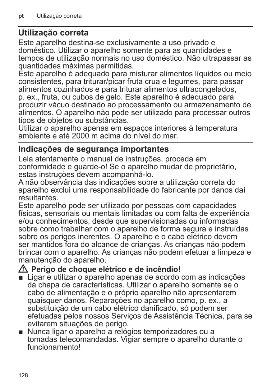 Este aparelho destina-se exclusivamente a uso privado e doméstico. Utilizar o aparelho somente para as quantidades e tempos de utilização normais no uso doméstico. Não ultrapassar as quantidades máximas permitidas. Este aparelho é adequado para misturar alimentos líquidos ou meio consistentes, para triturar/picar fruta crua e legumes, para passar alimentos cozinhados e para triturar alimentos ultracongelados, p. ex., fruta, ou cubos de gelo. Este aparelho é adequado para produzir vácuo destinado ao processamento ou armazenamento de alimentos. O aparelho não pode ser utilizado para processar outros tipos de objetos ou substâncias. Utilizar o aparelho apenas em espaços interiores à temperatura ambiente e até 2000 m acima do nível do mar.