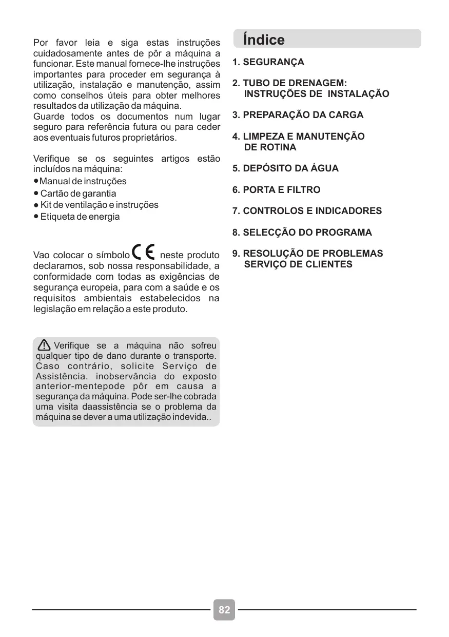 Índice 1. SEGURANÇA 2. TUBO DE DRENAGEM: INSTRUÇÕES DE INSTALAÇÃO 3. PREPARAÇÃO DA CARGA 4. LIMPEZA E MANUTENÇÃO DE ROTINA 5. DEPÓSITO DA ÁGUA 6. PORTA E FILTRO 7. CONTROLOS E INDICADORES
