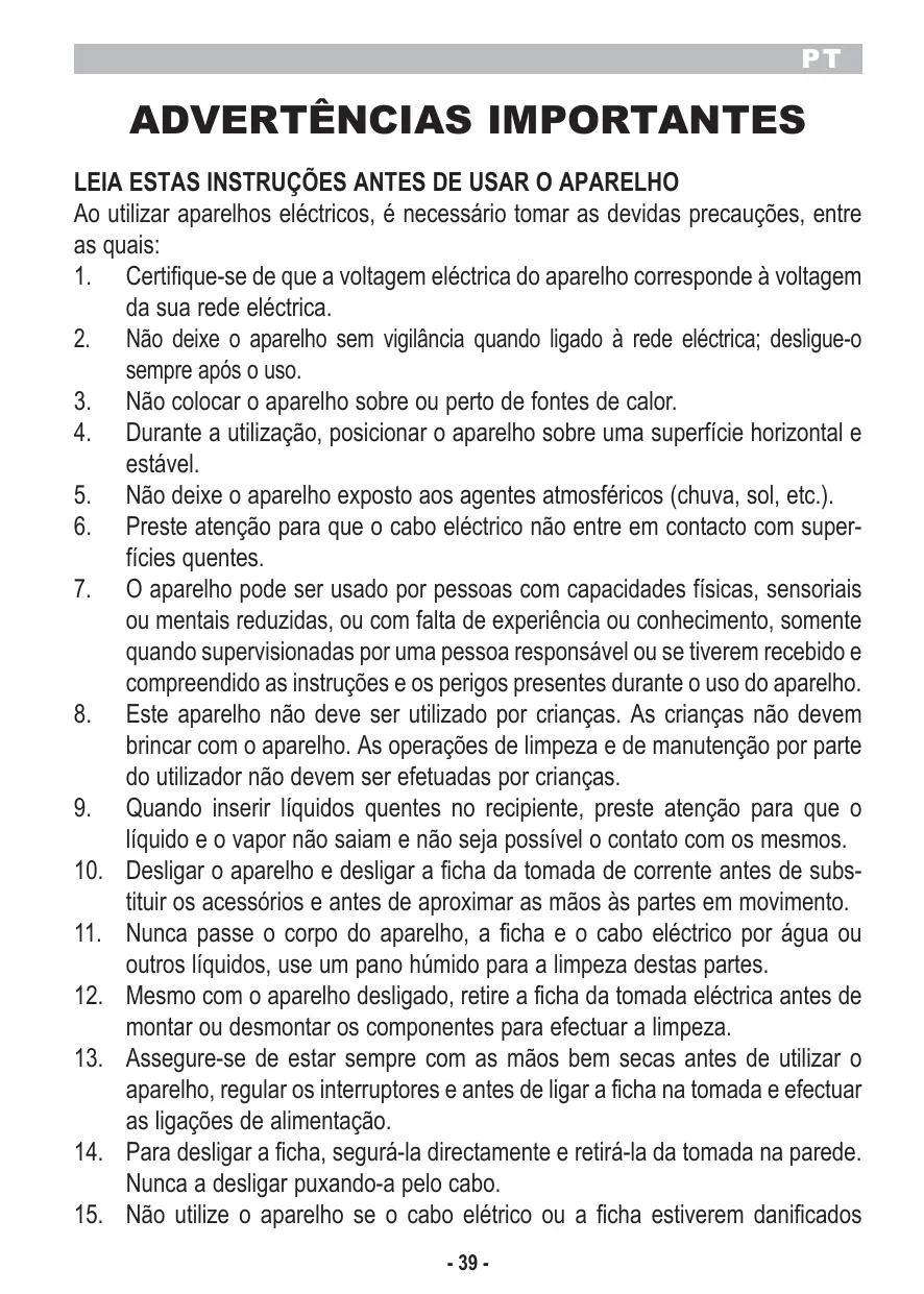PT ADVERTÊNCIAS IMPORTANTES LEIA ESTAS INSTRUÇÕES ANTES DE USAR O APARELHO Ao utilizar aparelhos eléctricos, é necessário tomar as devidas precauções, entre as quais: 1. Certifique-se de que a voltagem eléctrica do aparelho corresponde à voltagem da sua rede eléctrica. 2. Não deixe o aparelho sem vigilância quando ligado à rede eléctrica; desligue-o sempre após o uso. 3. Não colocar o aparelho sobre ou perto de fontes de calor. 4. Durante a utilização, posicionar o aparelho sobre uma superfície horizontal e estável. 5. Não deixe o aparelho exposto aos agentes atmosféricos (chuva, sol, etc.). 6. Preste atenção para que o cabo eléctrico não entre em contacto com superfícies quentes. 7. O aparelho pode ser usado por pessoas com capacidades físicas, sensoriais ou mentais reduzidas, ou com falta de experiência ou conhecimento, somente quando supervisionadas por uma pessoa responsável ou se tiverem recebido e compreendido as instruções e os perigos presentes durante o uso do aparelho. 8. Este aparelho não deve ser utilizado por crianças. As crianças não devem brincar com o aparelho. As operações de limpeza e de manutenção por parte do utilizador não devem ser efetuadas por crianças. 9. Quando inserir líquidos quentes no recipiente, preste atenção para que o líquido e o vapor não saiam e não seja possível o contato com os mesmos. 10. Desligar o aparelho e desligar a ficha da tomada de corrente antes de substituir os acessórios e antes de aproximar as mãos às partes em movimento. 11. Nunca passe o corpo do aparelho, a ficha e o cabo eléctrico por água ou outros líquidos, use um pano húmido para a limpeza destas partes. 12. Mesmo com o aparelho desligado, retire a ficha da tomada eléctrica antes de montar ou desmontar os componentes para efectuar a limpeza. 13. Assegure-se de estar sempre com as mãos bem secas antes de utilizar o aparelho, regular os interruptores e antes de ligar a ficha na tomada e efectuar as ligações de alimentação. 14. Para desligar a ficha, segurá-la directamente e retirá-la da tomada na parede. Nunca a desligar puxando-a pelo cabo. 15. Não utilize o aparelho se o cabo elétrico ou a ficha estiverem danificados - 39 -