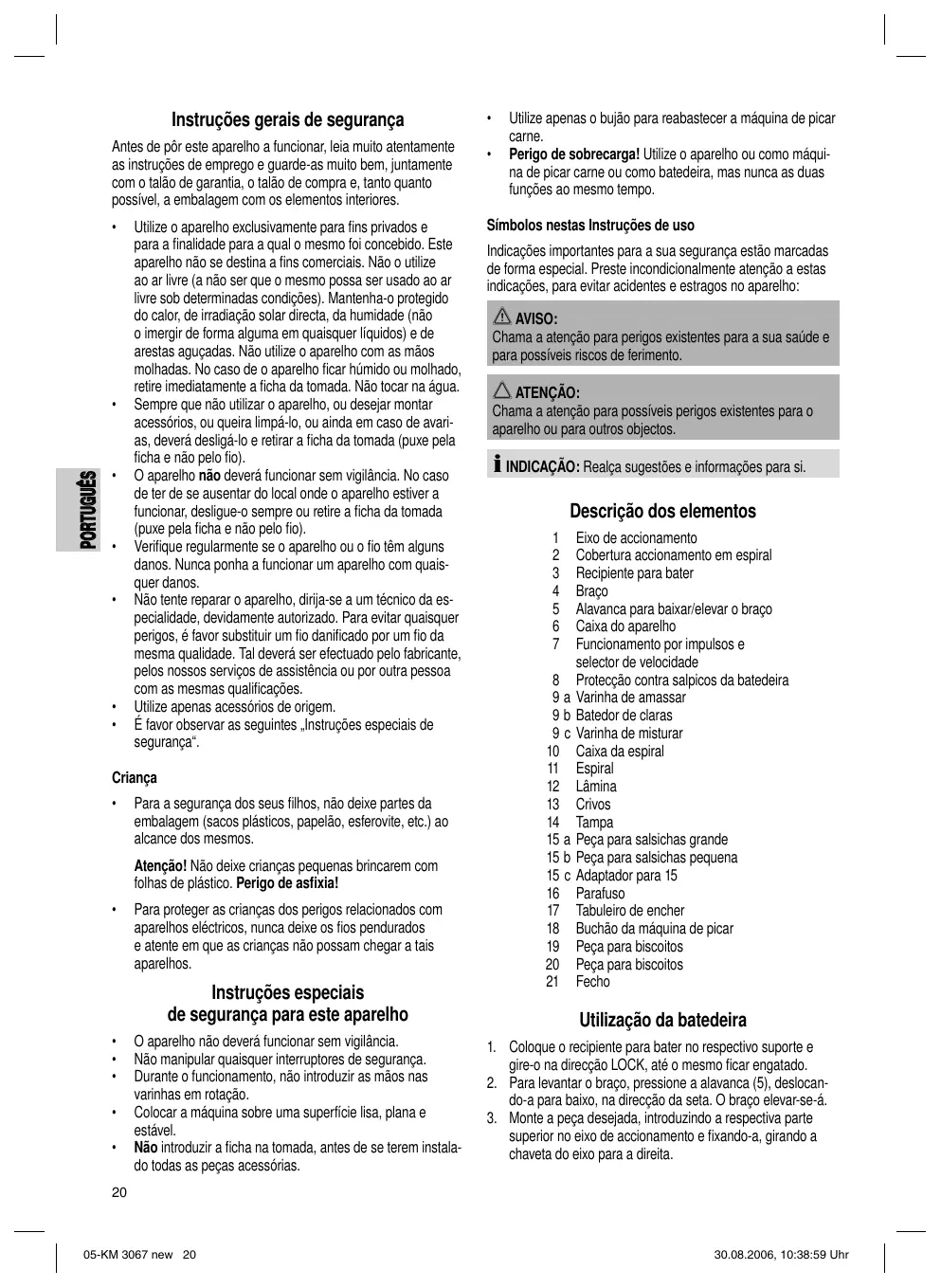 O aparelho não deverá funcionar sem vigilância. Não manipular quaisquer interruptores de segurança. Durante o funcionamento, não introduzir as mãos nas varinhas em rotação. Colocar a máquina sobre uma superfície lisa, plana e estável. Não introduzir a ficha na tomada, antes de se terem instalado todas as peças acessórias.
