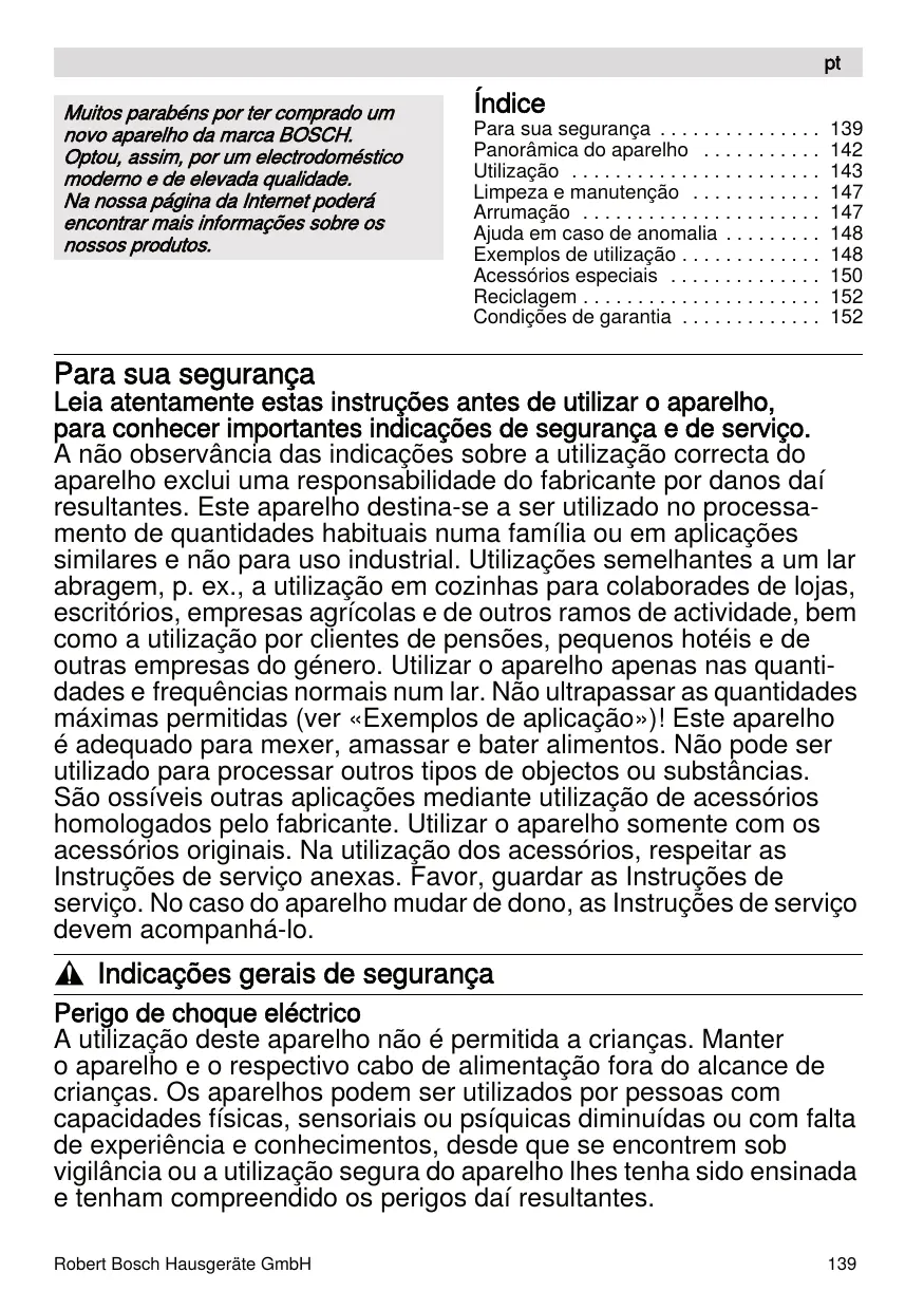 Para sua segurança Leia atentamente estas instruções antes de utilizar o aparelho, para conhecer importantes indicações de segurança e de serviço. A não observância das indicações sobre a utilização correcta do aparelho exclui uma responsabilidade do fabricante por danos daí resultantes. Este aparelho destina-se a ser utilizado no processamento de quantidades habituais numa família ou em aplicações similares e não para uso industrial. Utilizações semelhantes a um lar abragem, p. ex., a utilização em cozinhas para colaborades de lojas, escritórios, empresas agrícolas e de outros ramos de actividade, bem como a utilização por clientes de pensões, pequenos hotéis e de outras empresas do género. Utilizar o aparelho apenas nas quantidades e frequências normais num lar. Não ultrapassar as quantidades máximas permitidas (ver «Exemplos de aplicação»)! Este aparelho é adequado para mexer, amassar e bater alimentos. Não pode ser utilizado para processar outros tipos de objectos ou substâncias. São ossíveis outras aplicações mediante utilização de acessórios homologados pelo fabricante. Utilizar o aparelho somente com os acessórios originais. Na utilização dos acessórios, respeitar as Instruções de serviço anexas. Favor, guardar as Instruções de serviço. No caso do aparelho mudar de dono, as Instruções de serviço devem acompanhá-lo. , Indicações gerais de segurança Perigo de choque eléctrico A utilização deste aparelho não é permitida a crianças. Manter o aparelho e o respectivo cabo de alimentação fora do alcance de crianças. Os aparelhos podem ser utilizados por pessoas com capacidades físicas, sensoriais ou psíquicas diminuídas ou com falta de experiência e conhecimentos, desde que se encontrem sob vigilância ou a utilização segura do aparelho lhes tenha sido ensinada e tenham compreendido os perigos daí resultantes. Robert Bosch Hausgeräte GmbH