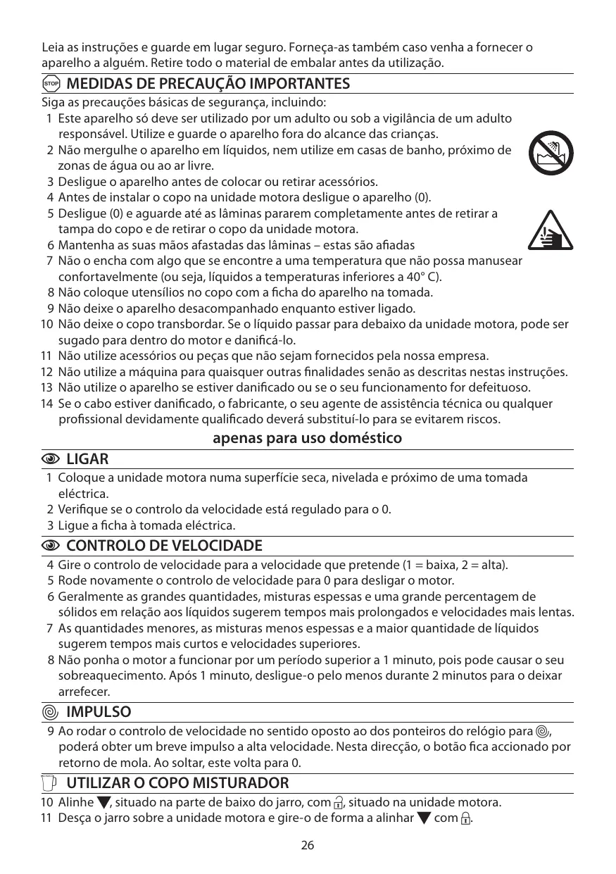 6 Mantenga las manos fuera de las hojas – están muy afiladas 7 No rellene la jarra con una sustancia más caliente de lo que usted pueda cómodamente soportar (como referencia, líquidos con una temperatura inferior a 40°C). 8 No ponga utensilios en la jarra cuando el aparato esté encendido. 9 No deje el aparato desatendido mientras está enchufado. 10 No permita rebosar la jarra. Si cae líquido debajo de la unidad motor, puede que éste sea aspirado al motor, dañándolo. 11 No ponga ningún otro acoplamiento o accesorio (recambio) que no haya sido adquirido del fabricante. 12 No use el aparato para ningún fin distinto a los descritos en estas instrucciones. 13 No use el aparato si está dañado o si no funciona bien. 14 Si el cable está dañado, éste deberá ser cambiado por el fabricante, su agente de servicio, o alguien con cualificación similar para evitar peligro. 12 Pulse la palanca para abrir la tapa. 13 Ponga los ingredientes en la jarra. 14 No la llene a más de la marca de 1500 ml. Si la llena más, el contenido puede expulsar la tapa afuera al encender el motor. 15 Cierre la tapa 16 Alinee las marcas de la tapa pequeña con las ranuras del agujero, encaje la tapa y gírela en el sentido de las agujas del reloj para bloquearla. 17 Para añadir ingredientes mientras la batidora está funcionando, extraiga la tapa pequeña, vierta los nuevos ingredientes a través del agujero y vuelva a colocar la tapa pequeña. 18 Compruebe que los ingredientes añadidos no hagan que el volumen supere la marca de 1500ml.