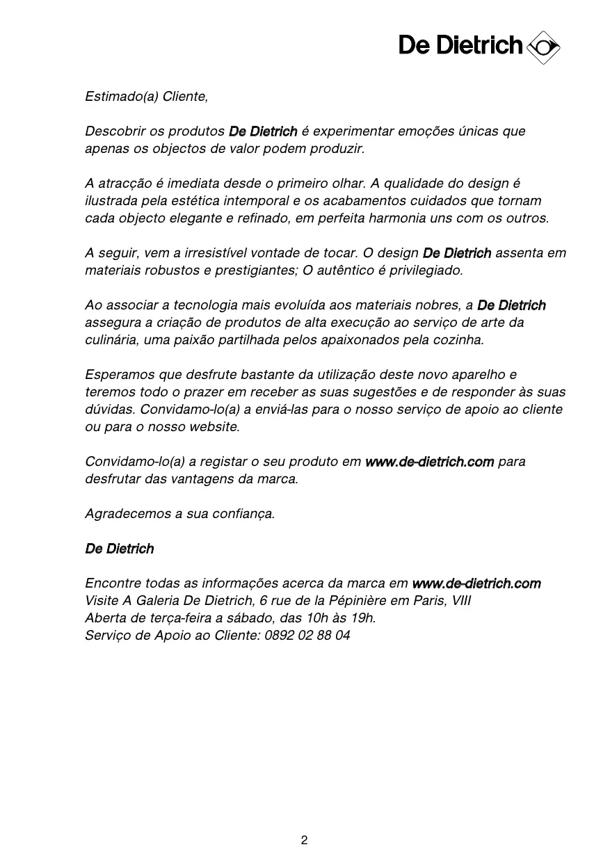 BETRIEBSANLEITUNG Four Oven Horno Forno Backofen Estimado(a) Cliente, Descobrir os produtos De Dietrich é experimentar emoções únicas que apenas os objectos de valor podem produzir. A atracção é imediata desde o primeiro olhar. A qualidade do design é ilustrada pela estética intemporal e os acabamentos cuidados que tornam cada objecto elegante e refinado, em perfeita harmonia uns com os outros. A seguir, vem a irresistível vontade de tocar. O design De Dietrich assenta em materiais robustos e prestigiantes; O autêntico é privilegiado. Ao associar a tecnologia mais evoluída aos materiais nobres, a De Dietrich assegura a criação de produtos de alta execução ao serviço de arte da culinária, uma paixão partilhada pelos apaixonados pela cozinha. Esperamos que desfrute bastante da utilização deste novo aparelho e teremos todo o prazer em receber as suas sugestões e de responder às suas dúvidas. Convidamo-lo(a) a enviá-las para o nosso serviço de apoio ao cliente ou para o nosso website. Convidamo-lo(a) a registar o seu produto em www.de-dietrich.com para desfrutar das vantagens da marca. Agradecemos a sua confiança. De Dietrich Encontre todas as informações acerca da marca em www.de-dietrich.com Visite A Galeria De Dietrich, 6 rue de la Pépinière em Paris, VIII Aberta de terça-feira a sábado, das 10h às 19h. Serviço de Apoio ao Cliente: 0892 02 88 04