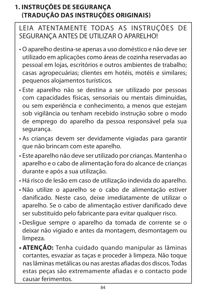 • L’appareil est destiné à un usage domestique seulement et n’est pas destiné à être utilisé dans des applications telles que : les cuisines du personnel dans les magasins, les bureaux et autres environnements de travail ; les fermes ; par les clients d’hôtels, de motels et d’autres environnements de type résidentiel ; les établissements de type chambres d’hôtes. • Cet appareil n’est pas destiné à être utilisé par des personnes ayant des capacités physiques, sensorielles ou mentales réduites ou un manque d’expérience et de connaissances, à moins qu’elles soient sous surveillance ou aient été informées de la manière de l’utiliser par une personne responsable de leur sécurité. • Surveiller les enfants afin de vous assurer qu’ils ne jouent pas avec ce produit. • Cet appareil ne doit pas être utilisé par des enfants. Garder l’appareil et son cordon d’alimentation hors de portée des enfants pendant et après son utilisation. • Il y a un risque de blessure si le produit est mal utilisé. • Ne pas utiliser l’appareil si le cordon d’alimentation est endommagé. Si le cordon d’alimentation est endommagé, cesser immédiatement d’utiliser l’appareil. Si le cordon d’alimentation est endommagé, le fabricant doit le remplacer afin d’éviter tout risque. • Toujours débrancher l’appareil de l’alimentation si vous le laissez sans surveillance ainsi qu’avant le montage, le démontage ou le nettoyage. • ATTENTION : Etre prudent lorsque vous manipulez les lames tranchantes, videz les bols et procédez au nettoyage. Ne pas 1