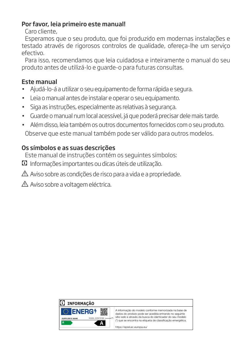 A informação do modelo conforme memorizada na base de dados do produto pode ser acedida entrando no seguinte sítio web e através da busca do identicador do seu modelo (*) que se encontra na etiqueta de classificação emergética. https://eprel.ec.europa.eu/