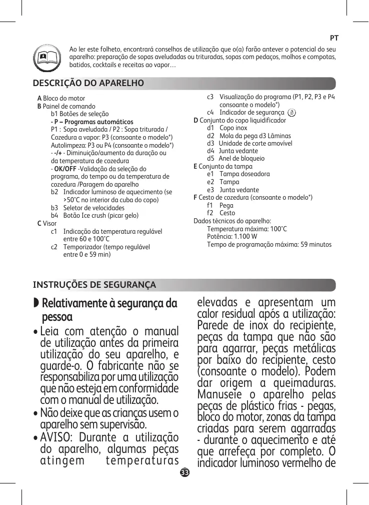 c3 Visualização do programa (P1, P2, P3 e P4 consoante o modelo*) c4 Indicador de segurança D Conjunto do copo liquidificador d1 Copo inox d2 Mola da pega d3 Lâminas d3 Unidade de corte amovível d4 Junta vedante d5 Anel de bloqueio E Conjunto da tampa e1 Tampa doseadora e2 Tampa e3 Junta vedante F Cesto de cozedura (consoante o modelo*) f1 Pega f2 Cesto Dados técnicos do aparelho: Temperatura máxima: 100°C Potência: 1.100 W Tempo de programação máxima: 59 minutos