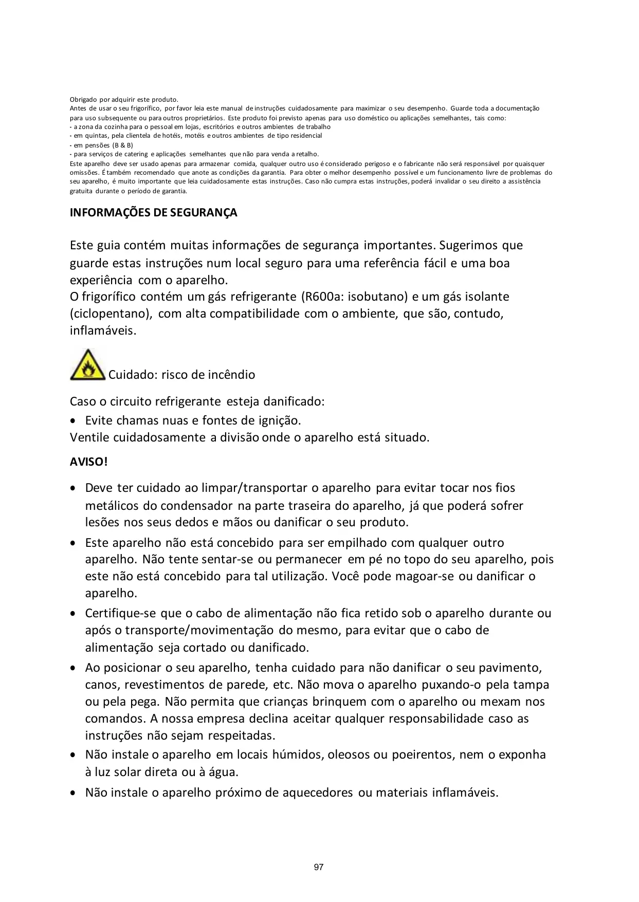 INFORMAÇÕES DE SEGURANÇA Este guia contém muitas informações de segurança importantes. Sugerimos que guarde estas instruções num local seguro para uma referência fácil e uma boa experiência com o aparelho. O frigorífico contém um gás refrigerante (R600a: isobutano) e um gás isolante (ciclopentano), com alta compatibilidade com o ambiente, que são, contudo, inflamáveis. Cuidado: risco de incêndio Caso o circuito refrigerante esteja danificado: • Evite chamas nuas e fontes de ignição. Ventile cuidadosamente a divisão onde o aparelho está situado. AVISO!