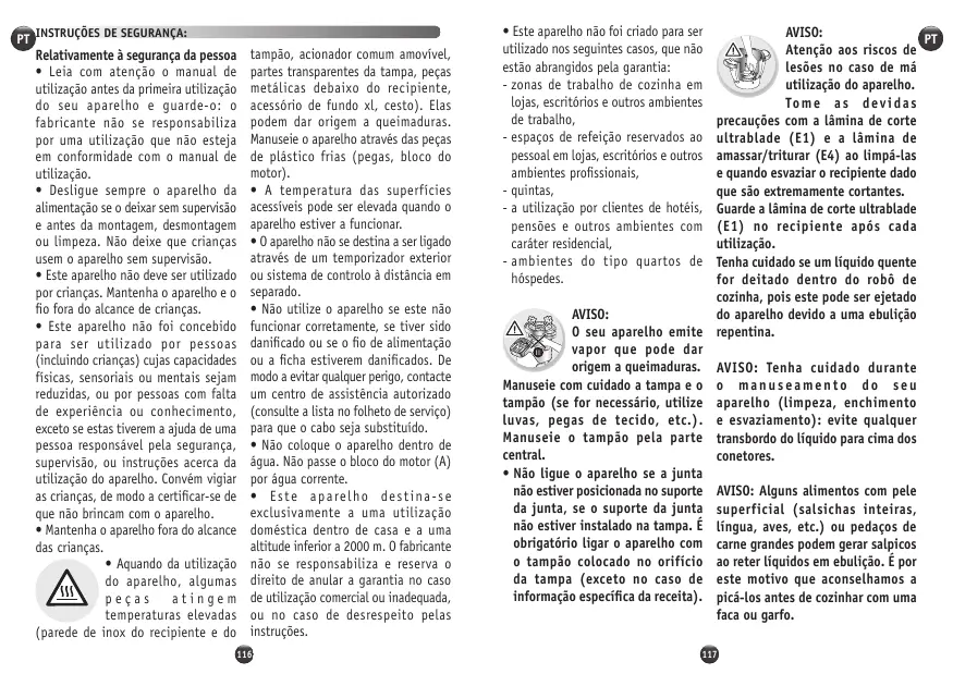 AVISO: PT Atenção aos riscos de lesões no caso de má utilização do aparelho. To m e a s d e v i d a s precauções com a lâmina de corte ultrablade (E1) e a lâmina de amassar/triturar (E4) ao limpá-las e quando esvaziar o recipiente dado que são extremamente cortantes. Guarde a lâmina de corte ultrablade (E1) no recipiente após cada utilização. Tenha cuidado se um líquido quente for deitado dentro do robô de cozinha, pois este pode ser ejetado AVISO: do aparelho devido a uma ebulição O seu aparelho emite repentina. vapor que pode dar origem a queimaduras. AVISO: Tenha cuidado durante Manuseie com cuidado a tampa e o o m a n u s e a m e n t o d o s e u tampão (se for necessário, utilize aparelho (limpeza, enchimento luvas, pegas de tecido, etc.). e esvaziamento): evite qualquer Manuseie o tampão pela parte transbordo do líquido para cima dos central. conetores. • Não ligue o aparelho se a junta não estiver posicionada no suporte AVISO: Alguns alimentos com pele da junta, se o suporte da junta superficial (salsichas inteiras, não estiver instalado na tampa. É língua, aves, etc.) ou pedaços de obrigatório ligar o aparelho com carne grandes podem gerar salpicos o tampão colocado no orifício ao reter líquidos em ebulição. É por da tampa (exceto no caso de este motivo que aconselhamos a informação específica da receita). picá-los antes de cozinhar com uma faca ou garfo. 117