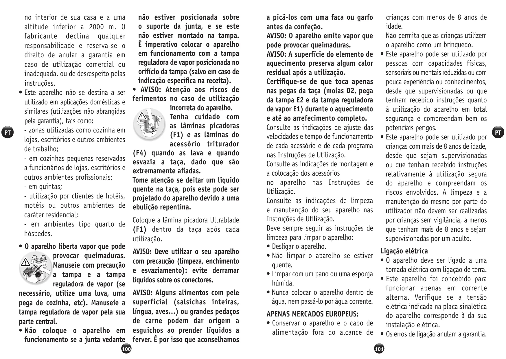 Prenez des précautions avec les lames du couteau hachoir ultrablade (F1) et du couteau pour pétrir/concasser (F4) lorsque vous les nettoyez et lorsque vous videz le bol, elles sont extrêmement coupantes. Soyez vigilant si un liquide chaud est versé dans le préparateur culinaire dans la mesure où il peut être éjecté de l’appareil en raison d’une ébullition soudaine. Rangez le couteau hachoir ultrablade (F1) dans le bol après chaque utili• Votre appareil émet de la sation. vapeur qui peut occasionner des brûlures. AVERTISSEMENT : Soyez prudent lors Manipulez avec précaution le couvercle de la manipulation de votre appareil et le bouchon (utilisez si nécessaire un (nettoyage, remplissage et versage) : gant, une manique, etc). Manipulez le éviter tout débordement de liquide sur bouchon par sa partie centrale. les connecteurs. •N e faites pas fonctionner l’appareil si le joint n’est pas positionné sur AVERTISSEMENT : Certains aliments le porte joint, si le porte joint n’est comportant une peau superficielle pas assemblé dans le couvercle. Il est (saucisses entières, langue, volaille...) impératif de faire fonctionner l’appa- ou de gros morceaux de viande peuvent reil avec le bouchon positionné dans générer des éclaboussures en empril’orifice du couvercle (sauf en cas sonnant des liquides bouillants. C’est d’information spécifique recette). pourquoi nous vous conseillons de les piquer avant cuisson à l’aide d’un couteau ou d’une fourchette. 2