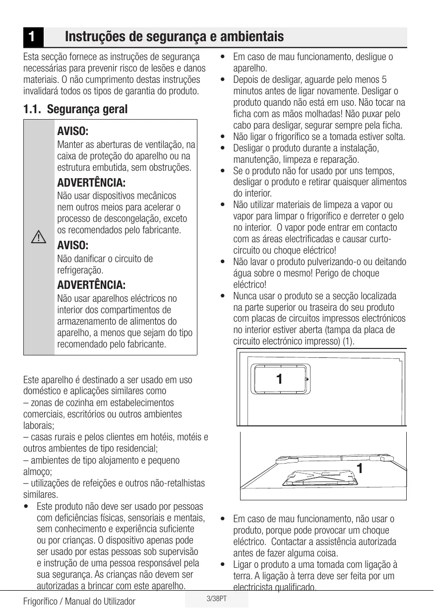 Instruções de segurança e ambientais • Em caso de mau funcionamento, desligue o aparelho. • Depois de desligar, aguarde pelo menos 5 minutos antes de ligar novamente. Desligar o produto quando não está em uso. Não tocar na ficha com as mãos molhadas! Não puxar pelo cabo para desligar, segurar sempre pela ficha. • Não ligar o frigorífico se a tomada estiver solta. • Desligar o produto durante a instalação, manutenção, limpeza e reparação. • Se o produto não for usado por uns tempos, desligar o produto e retirar quaisquer alimentos do interior. • Não utilizar materiais de limpeza a vapor ou vapor para limpar o frigorífico e derreter o gelo no interior. O vapor pode entrar em contacto com as áreas electrificadas e causar curtocircuito ou choque eléctrico! • Não lavar o produto pulverizando-o ou deitando água sobre o mesmo! Perigo de choque eléctrico! • Nunca usar o produto se a secção localizada na parte superior ou traseira do seu produto com placas de circuitos impressos electrónicos no interior estiver aberta (tampa da placa de circuito electrónico impresso) (1).