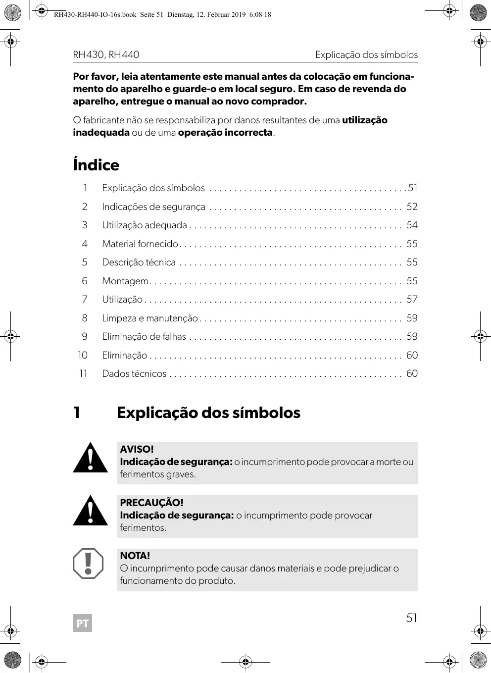 A PT Explicação dos símbolos AVISO! Indicação de segurança: o incumprimento pode provocar a morte ou ferimentos graves. PRECAUÇÃO! Indicação de segurança: o incumprimento pode provocar ferimentos. NOTA! O incumprimento pode causar danos materiais e pode prejudicar o funcionamento do produto.