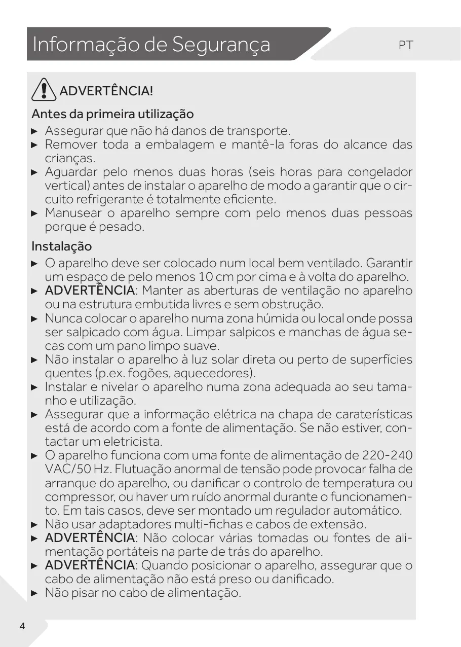 ▶ Coloque el aparato de forma nivelada en un lugar adecuado para su tamaño y uso. ▶ Asegúrese de que la información eléctrica de la placa de características coincide con la fuente de alimentación. En caso contrario, comuníquese con un electricista. ▶ El aparato funciona con corriente de 220-240 VAC/50 Hz. Una fluctuación anormal del voltaje puede causar que el aparato no se encienda, o que se dañe el control de temperatura o el compresor, o que haya un ruido anormal durante el funcionamiento. En tal caso, se deberá usar un regulador automático. ▶ No use adaptadores múltiples ni cables de extensión. ▶ ADVERTENCIA: No coloque varios enchufes alargadores múltiples ni tomas o fuentes de alimentación portátiles en la parte trasera del aparato. ▶ ADVERTENCIA: Al colocar el aparato, asegúrese de que el cable de corriente no esté atrapado o dañado. ▶ No pise el cable de corriente. 4 - Guarde la carne y el pescado crudos en recipientes adecuados en el frigorífico o congelador, de modo que no estén en contacto con otros alimentos ni goteen sobre ellos. Para garantizar la conservación segura de los alimentos, se deberán guardar por separado la comida rápida y la carne o el pescado crudos. - Los compartimentos de dos estrellas para congelados son adecuados para guardar alimentos pre-congelados, conservar o hacer helados y cubitos de hielo. - Los compartimentos de una, dos y tres estrellas no son adecuados para la congelación de alimentos frescos. - Si va a dejar el frigorífico vacío durante mucho tiempo, apáguelo, descongélelo, límpielo, séquelo y deje la puerta abierta para evitar que se forme moho en su interior. ▶ En otra sección de este manual podrá encontrarse información detallada sobre la zona más adecuada del aparato en la cual guardar determinados tipos de alimentos, teniendo en cuenta la distribución de la temperatura de los distintos compartimentos del aparato.