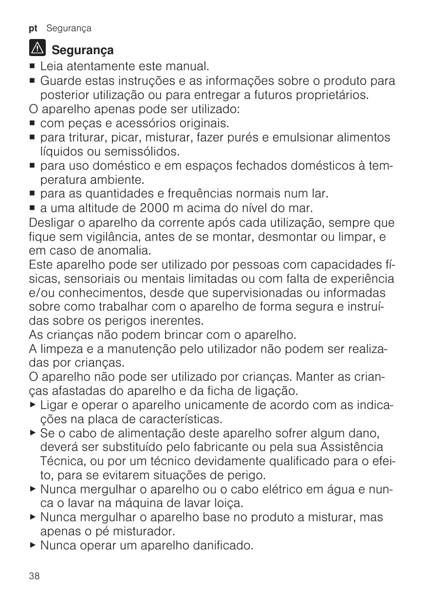 ¡ Read this instruction manual carefully. ¡ Keep the instruction manual and the product information safe for future reference or for the next owner. ¡ pour broyer, hacher, mixer, réduire en purée et émulsionner des produits alimentaires liquides ou mi-ferme. ¡ pour un usage domestique privé et dans les pièces fermées d’un domicile, à la température ambiante. ¡ pour les quantités de préparation et durées de traitement habituelles pour un ménage. ¡ à une hauteur maximale de 2000 m au-dessus du niveau de la mer. L’appareil doit toujours être débranché du secteur, après chaque utilisation, lorsqu’il n’est pas sous surveillance, lorsqu’il doit être monté ou démonté, avant de le nettoyer et en cas de panne. Cet appareil peut être utilisé par des personnes aux capacités physiques, sensorielles ou mentales réduites ou des personnes inexpérimentées, à condition qu'elles soient surveillées ou qu'elles aient été informées de l'utilisation de l'appareil et qu'elles comprennent les risques inhérents à son usage. Les enfants ne sont pas autorisés à jouer avec l'appareil. Le nettoyage et l’entretien de l'appareil ne doivent pas être effectués par des enfants. L'appareil ne doit pas être utilisé par des enfants. Les enfants doivent être tenus à distance de l’appareil et du cordon d’alimentation secteur. ▶ Pour le raccordement et l’utilisation de l’appareil, respectez impérativement les indications figurant sur la plaque signalétique. ▶ Afin d’écarter tout danger quand le cordon d’alimentation secteur de cet appareil est endommagé, seul le fabricant ou son service après-vente ou toute autre personne de qualification équivalente est habilité à le remplacer. ▶ Ne jamais plonger l’appareil ou le cordon d’alimentation secteur dans l’eau et ne pas les mettre au lave-vaisselle. 13