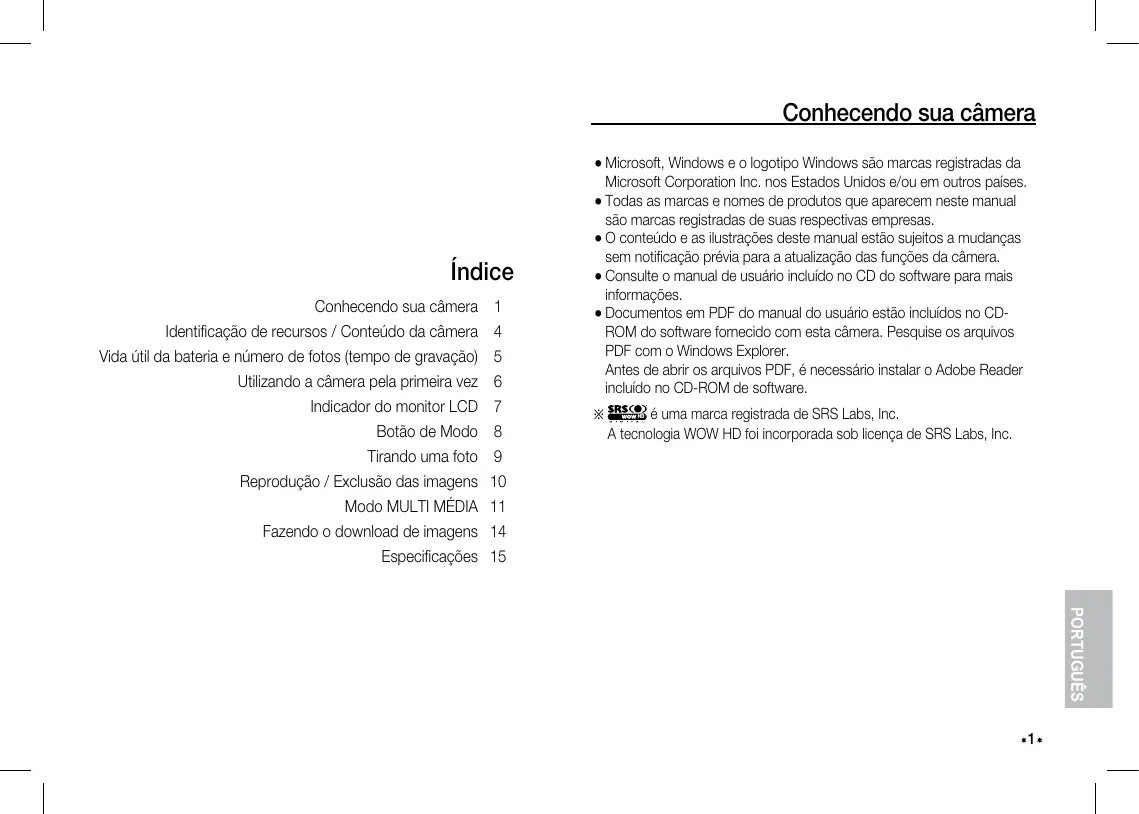 å Microsoft, Windows e o logotipo Windows são marcas registradas da Microsoft Corporation Inc. nos Estados Unidos e/ou em outros países. å Todas as marcas e nomes de produtos que aparecem neste manual são marcas registradas de suas respectivas empresas. å O conteúdo e as ilustrações deste manual estão sujeitos a mudanças sem notificação prévia para a atualização das funções da câmera. å Consulte o manual de usuário incluído no CD do software para mais informações. å Documentos em PDF do manual do usuário estão incluídos no CDROM do software fornecido com esta câmera. Pesquise os arquivos PDF com o Windows Explorer. Antes de abrir os arquivos PDF, é necessário instalar o Adobe Reader incluído no CD-ROM de software. é uma marca registrada de SRS Labs, Inc. A tecnologia WOW HD foi incorporada sob licença de SRS Labs, Inc.