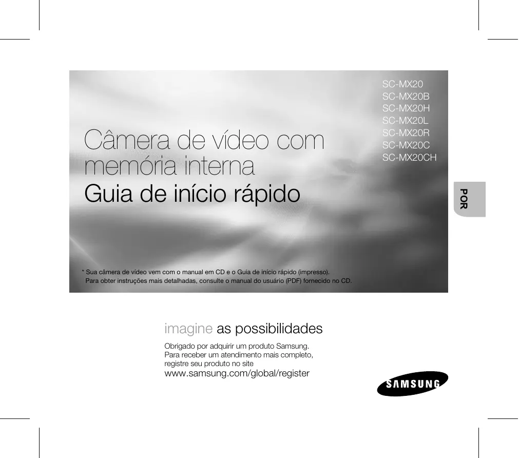 - Sua câmera de vídeo vem com o manual em CD e o Guia de início rápido (impresso). Para obter instruções mais detalhadas, consulte o manual do usuário (PDF) fornecido no CD. imagine as possibilidades Obrigado por adquirir um produto Samsung. Para receber um atendimento mais completo, registre seu produto no site www.samsung.com/global/register POR Guia de início rápido SC-MX20 SC-MX20B SC-MX20H SC-MX20L SC-MX20R SC-MX20C SC-MX20CH conhecendo a câmera de vídeo com memória interna O QUE ESTÁ INCLUÍDO COM SUA CÂMERA DE VÍDEO COM MEMÓRIA INTERNA A nova câmera de vídeo com memória interna vem com os seguintes acessórios. Se algum desses itens estiver faltando na caixa, entre em contato com a Central de atendimento ao cliente Samsung. + A forma exata de cada item pode variar dependendo do modelo. Bateria (IA-BP85ST) Adaptador CA (tipo AA-E9) Cabo de áudio/vídeo Cabo USB CD do software CD do manual do usuário Guia de início rápido Suporte* Bolsa* de transporte*