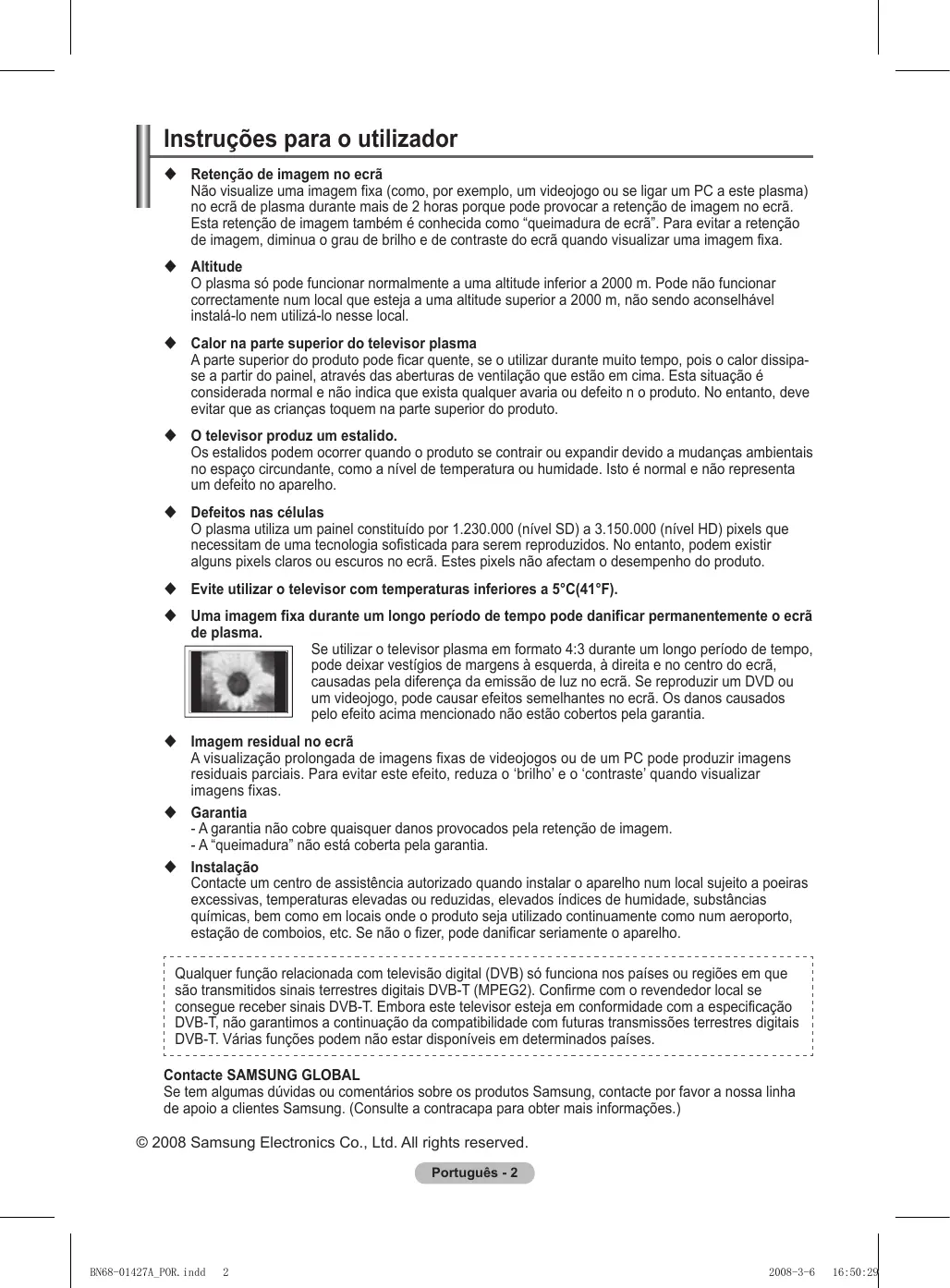 2008-3-6 16:45:19 Instruções para o utilizador Retenção de imagem no ecrã Não visualize uma imagem fixa (como, por exemplo, um videojogo ou se ligar um PC a este plasma) no ecrã de plasma durante mais de 2 horas porque pode provocar a retenção de imagem no ecrã. Esta retenção de imagem também é conhecida como “queimadura de ecrã”. Para evitar a retenção de imagem, diminua o grau de brilho e de contraste do ecrã quando visualizar uma imagem fixa. Altitude O plasma só pode funcionar normalmente a uma altitude inferior a 2000 m. Pode não funcionar correctamente num local que esteja a uma altitude superior a 2000 m, não sendo aconselhável instalá-lo nem utilizá-lo nesse local. Calor na parte superior do televisor plasma A parte superior do produto pode ficar quente, se o utilizar durante muito tempo, pois o calor dissipase a partir do painel, através das aberturas de ventilação que estão em cima. Esta situação é considerada normal e não indica que exista qualquer avaria ou defeito n o produto. No entanto, deve evitar que as crianças toquem na parte superior do produto. O televisor produz um estalido. Os estalidos podem ocorrer quando o produto se contrair ou expandir devido a mudanças ambientais no espaço circundante, como a nível de temperatura ou humidade. Isto é normal e não representa um defeito no aparelho. Defeitos nas células O plasma utiliza um painel constituído por 1.230.000 (nível SD) a 3.150.000 (nível HD) pixels que necessitam de uma tecnologia sofisticada para serem reproduzidos. No entanto, podem existir alguns pixels claros ou escuros no ecrã. Estes pixels não afectam o desempenho do produto. Evite utilizar o televisor com temperaturas inferiores a 5°C(41°F). Uma imagem fixa durante um longo período de tempo pode danificar permanentemente o ecrã de plasma. Se utilizar o televisor plasma em formato 4:3 durante um longo período de tempo, pode deixar vestígios de margens à esquerda, à direita e no centro do ecrã, causadas pela diferença da emissão de luz no ecrã. Se reproduzir um DVD ou um videojogo, pode causar efeitos semelhantes no ecrã. Os danos causados pelo efeito acima mencionado não estão cobertos pela garantia. Imagem residual no ecrã A visualização prolongada de imagens fixas de videojogos ou de um PC pode produzir imagens residuais parciais. Para evitar este efeito, reduza o ‘brilho’ e o ‘contraste’ quando visualizar imagens fixas. Garantia - A garantia não cobre quaisquer danos provocados pela retenção de imagem. - A “queimadura” não está coberta pela garantia. Instalação Contacte um centro de assistência autorizado quando instalar o aparelho num local sujeito a poeiras excessivas, temperaturas elevadas ou reduzidas, elevados índices de humidade, substâncias químicas, bem como em locais onde o produto seja utilizado continuamente como num aeroporto, estação de comboios, etc. Se não o fizer, pode danificar seriamente o aparelho. Qualquer função relacionada com televisão digital (DVB) só funciona nos países ou regiões em que são transmitidos sinais terrestres digitais DVB-T (MPEG2). Confirme com o revendedor local se consegue receber sinais DVB-T. Embora este televisor esteja em conformidade com a especificação DVB-T, não garantimos a continuação da compatibilidade com futuras transmissões terrestres digitais DVB-T. Várias funções podem não estar disponíveis em determinados países. Contacte SAMSUNG GLOBAL Se tem algumas dúvidas ou comentários sobre os produtos Samsung, contacte por favor a nossa linha de apoio a clientes Samsung. (Consulte a contracapa para obter mais informações.) © 2008 Samsung Electronics Co., Ltd. All rights reserved. Português - BN68-01427A_POR.indd