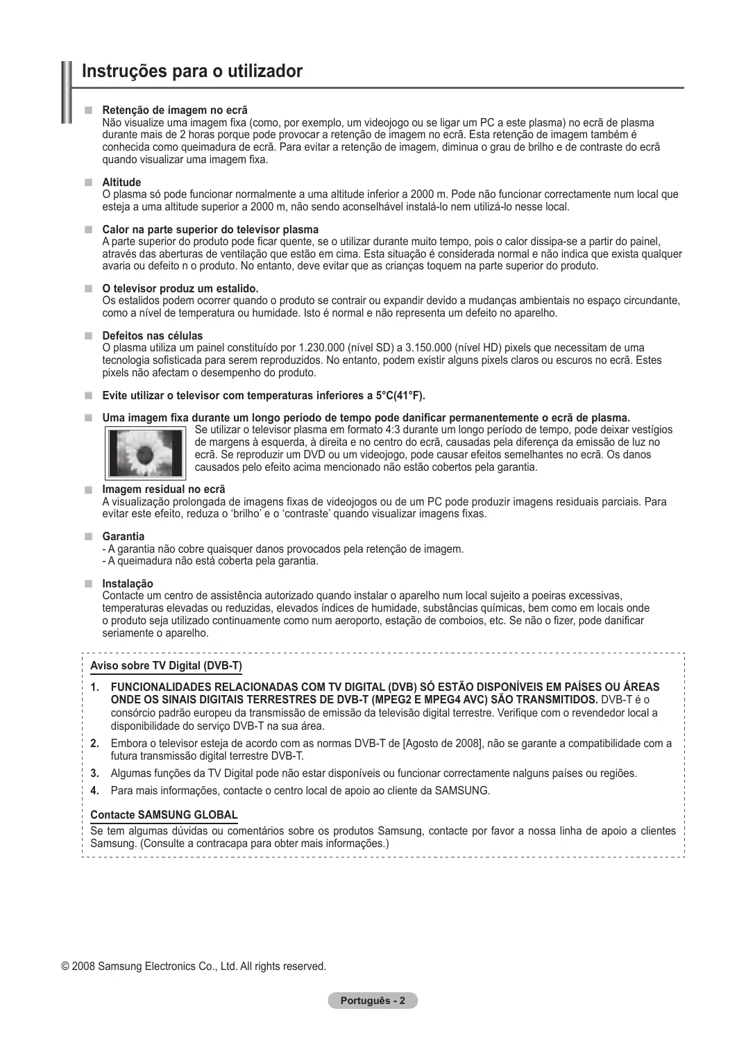 2008-8-28 11:15:57 Instruções para o utilizador Retenção de imagem no ecrã Não visualize uma imagem fixa (como, por exemplo, um videojogo ou se ligar um PC a este plasma) no ecrã de plasma durante mais de 2 horas porque pode provocar a retenção de imagem no ecrã. Esta retenção de imagem também é conhecida como queimadura de ecrã. Para evitar a retenção de imagem, diminua o grau de brilho e de contraste do ecrã quando visualizar uma imagem fixa. Altitude O plasma só pode funcionar normalmente a uma altitude inferior a 2000 m. Pode não funcionar correctamente num local que esteja a uma altitude superior a 2000 m, não sendo aconselhável instalá-lo nem utilizá-lo nesse local. Calor na parte superior do televisor plasma A parte superior do produto pode ficar quente, se o utilizar durante muito tempo, pois o calor dissipa-se a partir do painel, através das aberturas de ventilação que estão em cima. Esta situação é considerada normal e não indica que exista qualquer avaria ou defeito n o produto. No entanto, deve evitar que as crianças toquem na parte superior do produto. O televisor produz um estalido. Os estalidos podem ocorrer quando o produto se contrair ou expandir devido a mudanças ambientais no espaço circundante, como a nível de temperatura ou humidade. Isto é normal e não representa um defeito no aparelho. Defeitos nas células O plasma utiliza um painel constituído por 1.230.000 (nível SD) a 3.150.000 (nível HD) pixels que necessitam de uma tecnologia sofisticada para serem reproduzidos. No entanto, podem existir alguns pixels claros ou escuros no ecrã. Estes pixels não afectam o desempenho do produto. Evite utilizar o televisor com temperaturas inferiores a 5°C(41°F). Uma imagem fixa durante um longo período de tempo pode danificar permanentemente o ecrã de plasma. Se utilizar o televisor plasma em formato 4:3 durante um longo período de tempo, pode deixar vestígios de margens à esquerda, à direita e no centro do ecrã, causadas pela diferença da emissão de luz no ecrã. Se reproduzir um DVD ou um videojogo, pode causar efeitos semelhantes no ecrã. Os danos causados pelo efeito acima mencionado não estão cobertos pela garantia. Imagem residual no ecrã A visualização prolongada de imagens fixas de videojogos ou de um PC pode produzir imagens residuais parciais. Para evitar este efeito, reduza o ‘brilho’ e o ‘contraste’ quando visualizar imagens fixas. Garantia - A garantia não cobre quaisquer danos provocados pela retenção de imagem. - A queimadura não está coberta pela garantia. Instalação Contacte um centro de assistência autorizado quando instalar o aparelho num local sujeito a poeiras excessivas, temperaturas elevadas ou reduzidas, elevados índices de humidade, substâncias químicas, bem como em locais onde o produto seja utilizado continuamente como num aeroporto, estação de comboios, etc. Se não o fizer, pode danificar seriamente o aparelho. Aviso sobre TV Digital (DVB-T)