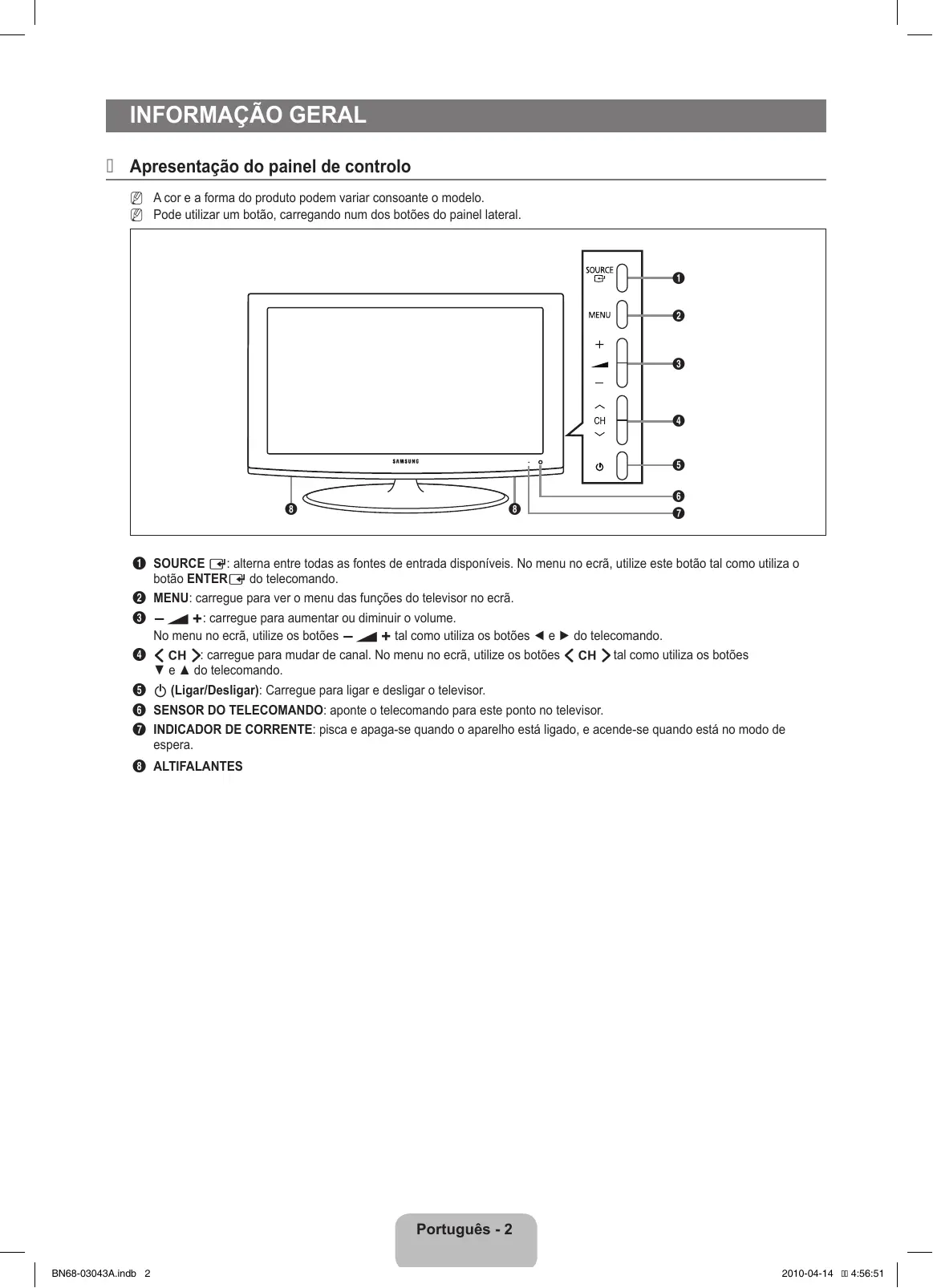 ¦¦ Apresentação do painel de controlo NN A cor e a forma do produto podem variar consoante o modelo. NN Pode utilizar um botão, carregando num dos botões do painel lateral.