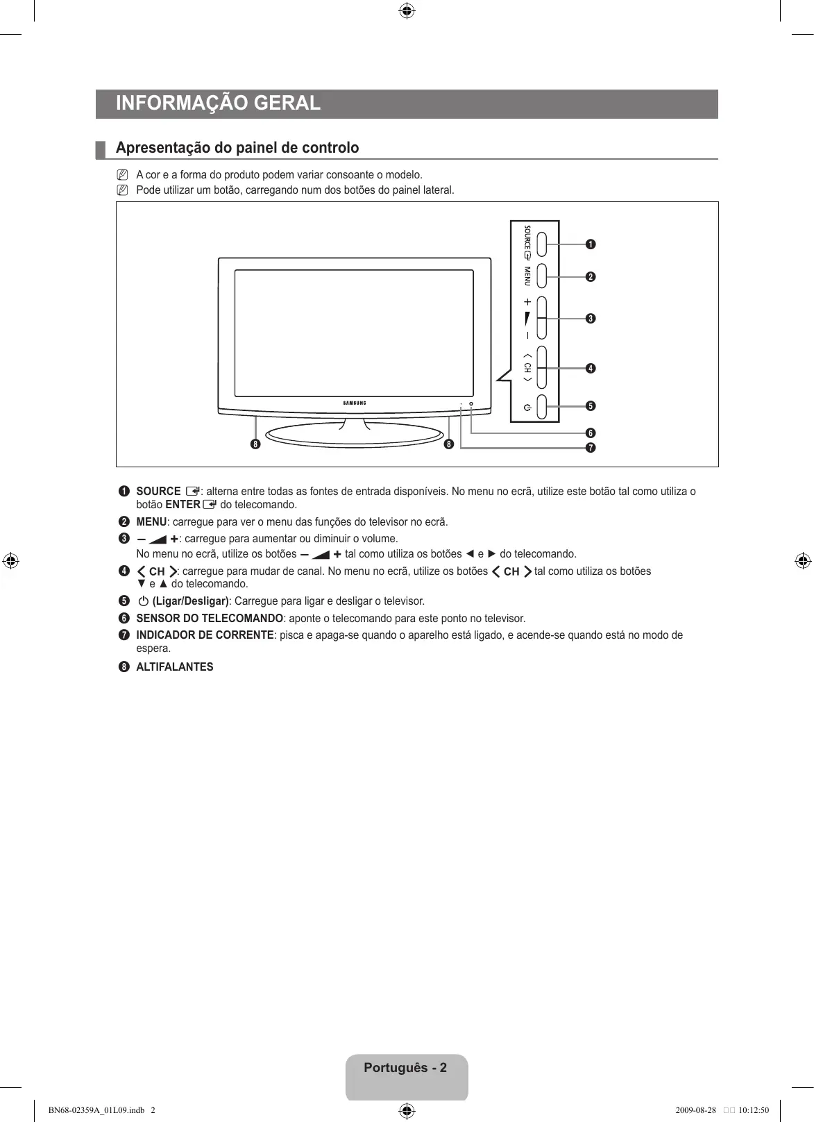 ¦ Apresentação do painel de controlo N A cor e a forma do produto podem variar consoante o modelo. N Pode utilizar um botão, carregando num dos botões do painel lateral.