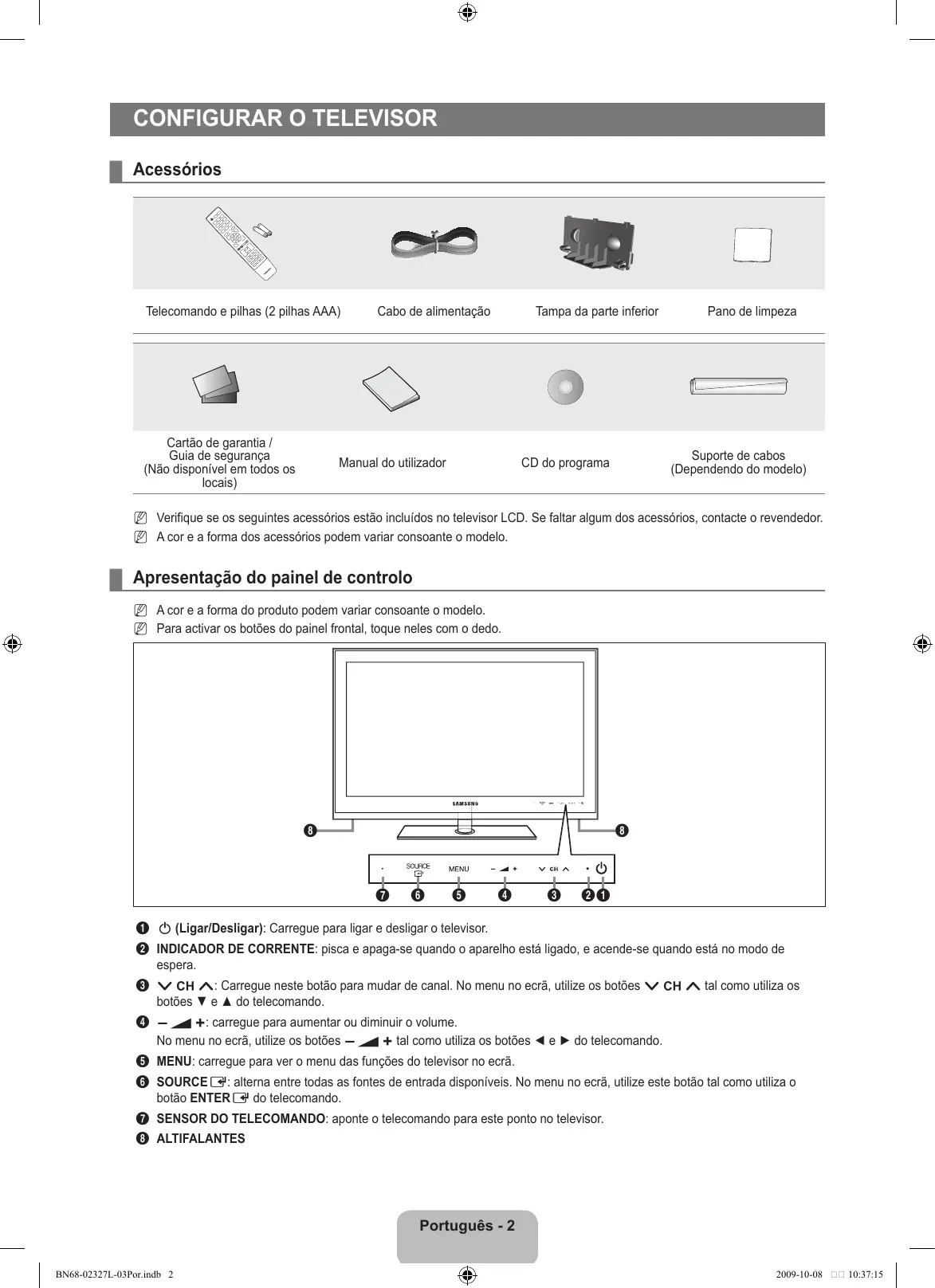 Nota Tecla rápida Botão TOOLS Carregue Português - BN68-02327L-03Por.indb 1 2009-10-08 10:37:14 Configurar o televisor ¦ Acessórios Telecomando e pilhas (2 pilhas AAA) Cartão de garantia / Guia de segurança (Não disponível em todos os locais) Cabo de alimentação Tampa da parte inferior Manual do utilizador Pano de limpeza Suporte de cabos (Dependendo do modelo) CD do programa N Verifique se os seguintes acessórios estão incluídos no televisor LCD. Se faltar algum dos acessórios, contacte o revendedor. N A cor e a forma dos acessórios podem variar consoante o modelo. ¦ Apresentação do painel de controlo N A cor e a forma do produto podem variar consoante o modelo. N Para activar os botões do painel frontal, toque neles com o dedo.